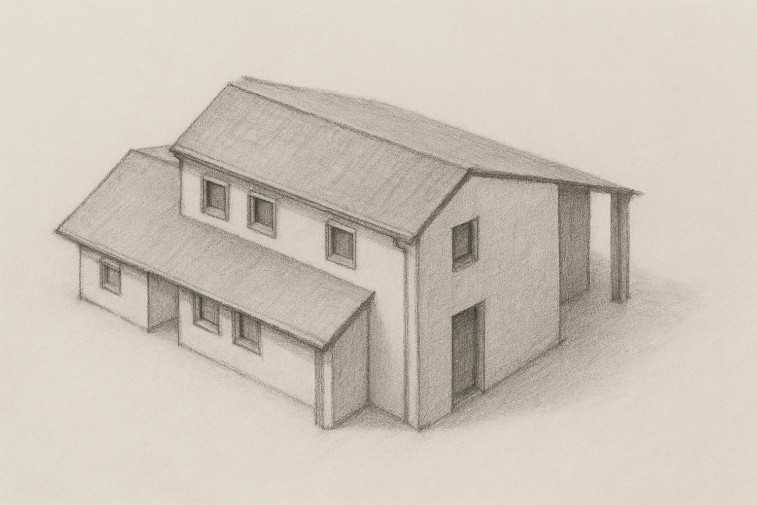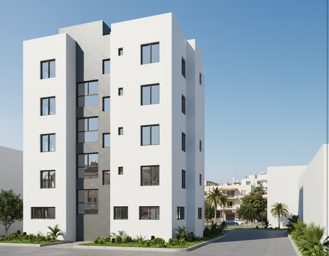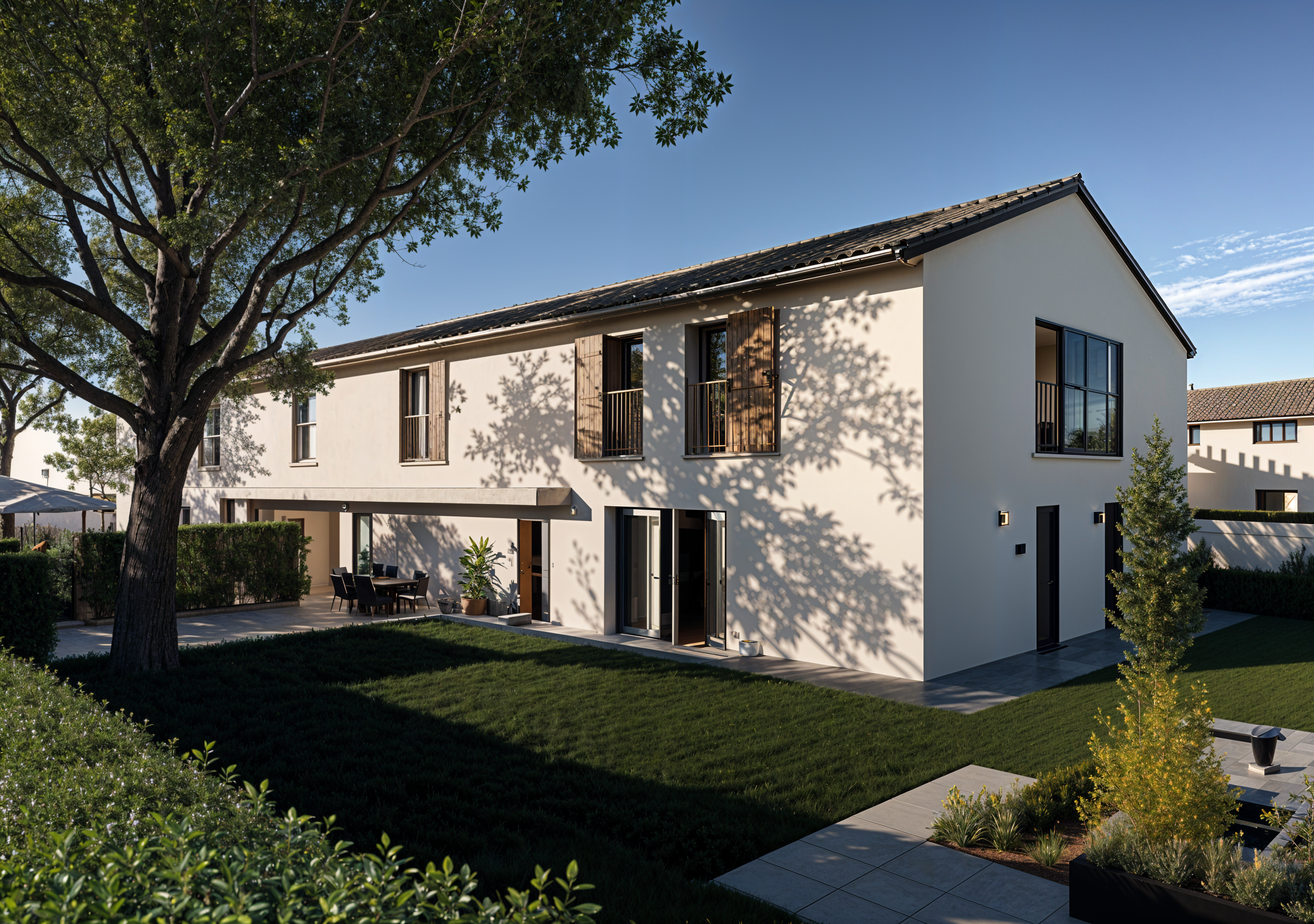 modern two story house in a serene suburban setting surrounded by lush greenery and large trees the house features white walls with wooden accents on the windows and a sleek black roof the front yard has a well maintained lawn and various plants in shades of green and yellow the sky is a clear blue creating a peaceful and natural atmosphere sunlight filters through the trees casting gentle shadows on the house facade render in a warm inviting light to enhance the tranquil environment architecture
