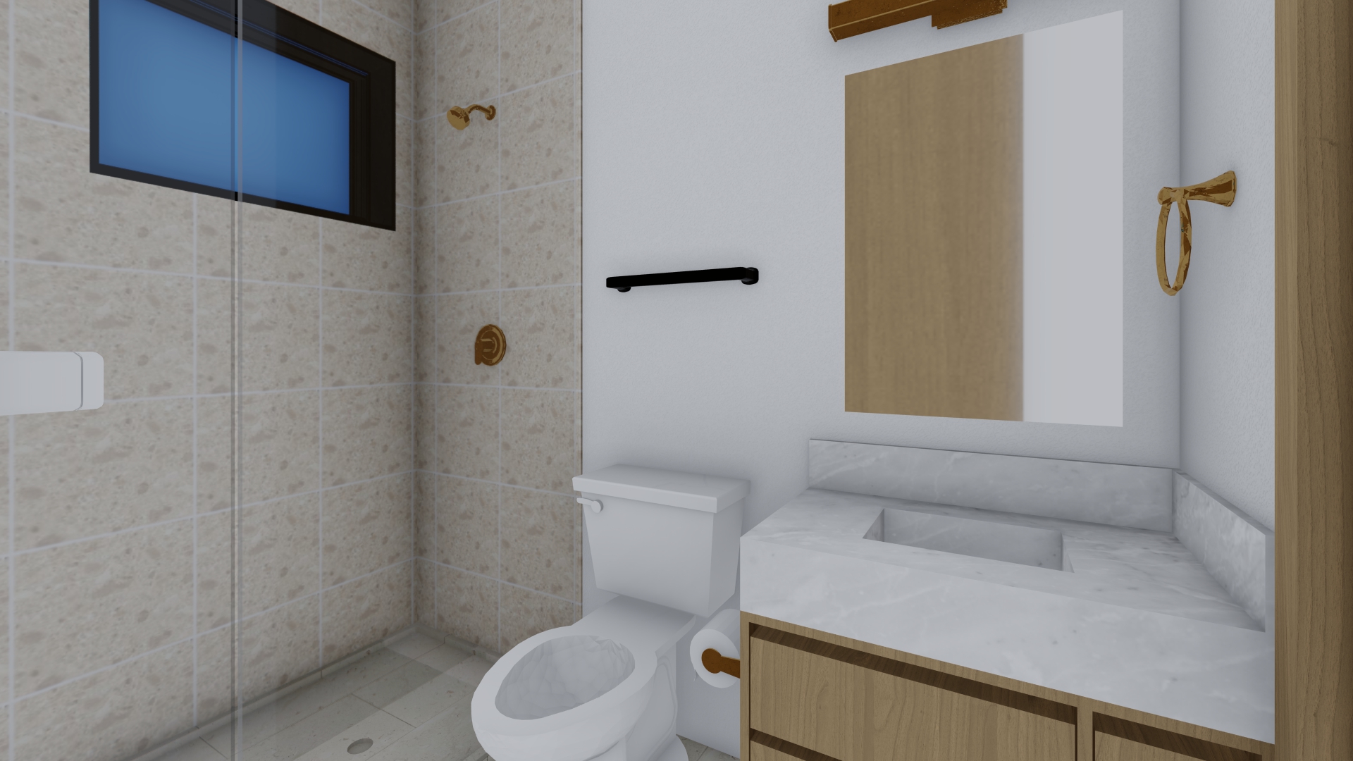 refine this one use same strategy run this view add niche and wall scone light no light at shower head this is good use this strategy render another view only one horizontal light in shower no scone light on wall sunny day outside window this is good use same strategy render this one