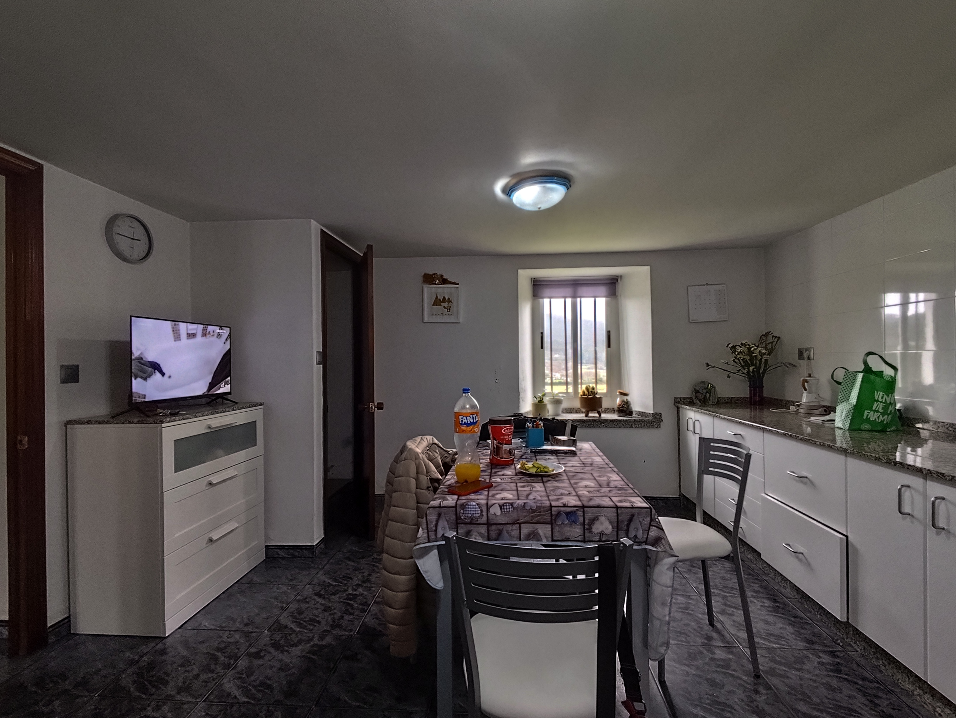 techo de madera nueva mesa decorada con flores cortinas en las ventanas y puertas de color blanco los muebles de cocina con acabado verde oliva en el techo con downlights