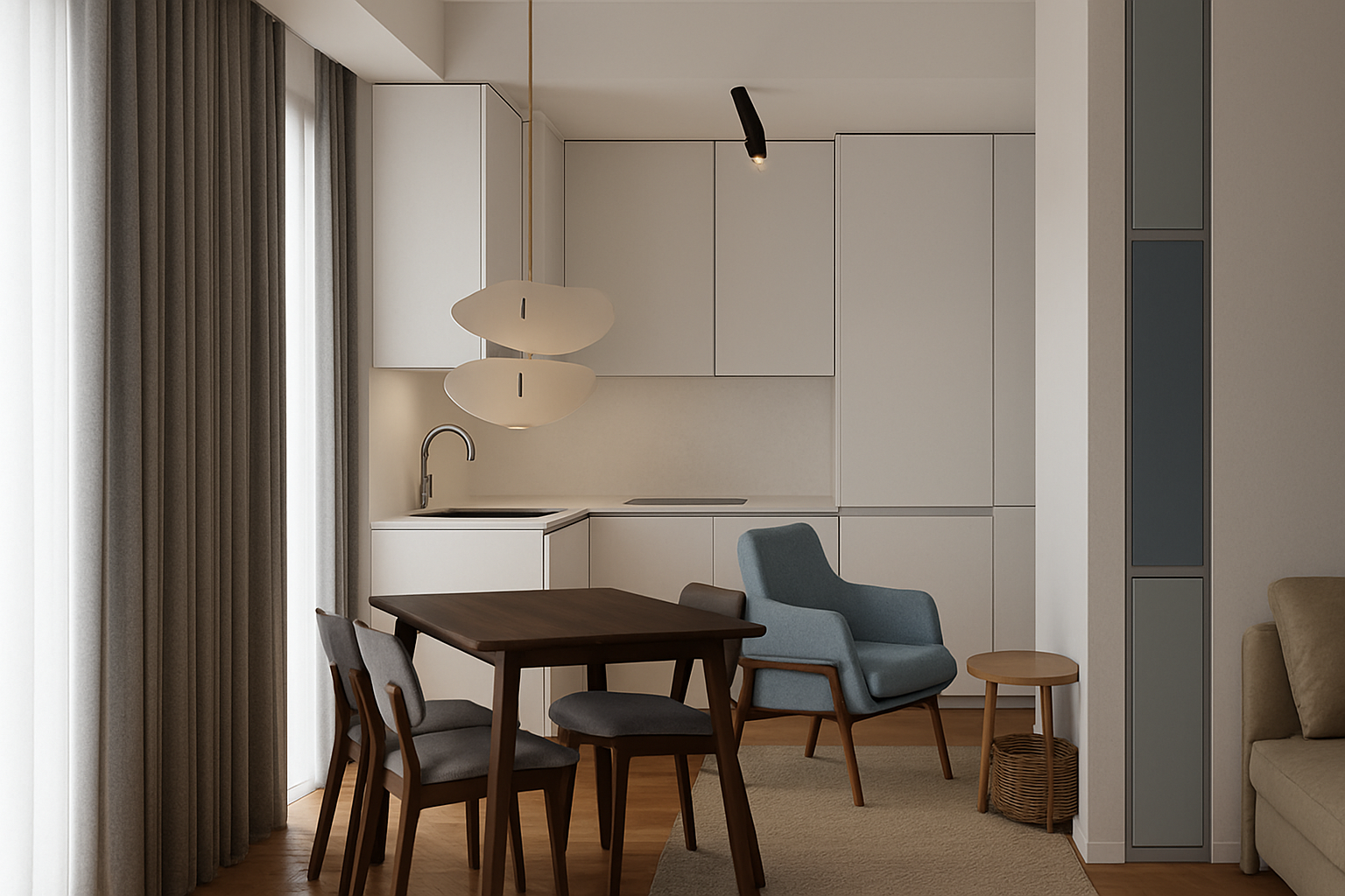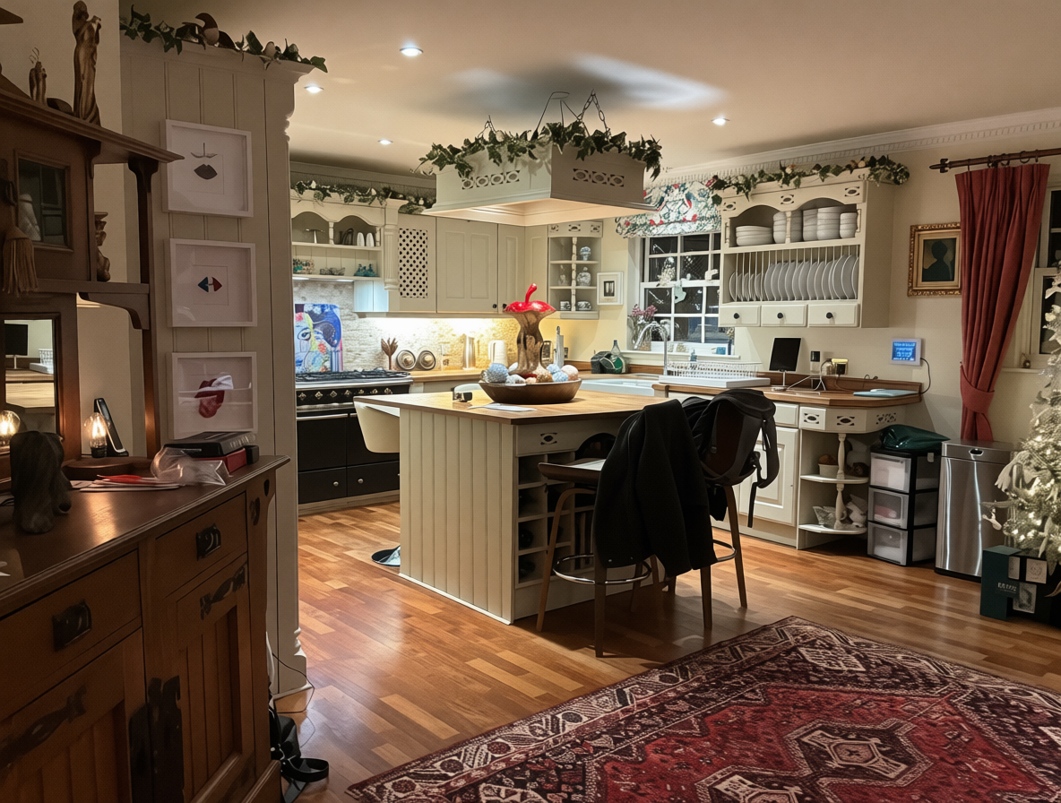 remove christmas decorations from this image remove rug from this image remove the bowl from the kitchen island remove the bar stools