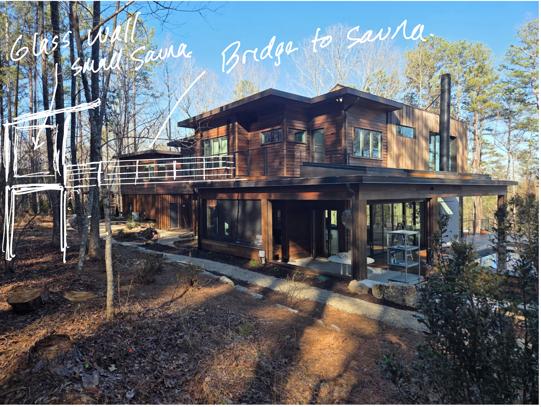 exterior shot modern two story house in a serene woodland setting featuring dark wooden exteriors and large glass windows a small glass walled sauna sitting above ground is connected by a sleek bridge surrounding the house tall trees with a mix of green and autumn leaves and a ground covered in brown earth and fallen leaves the sky is a clear bright blue casting gentle light and creating soft shadows for a tranquil atmosphere