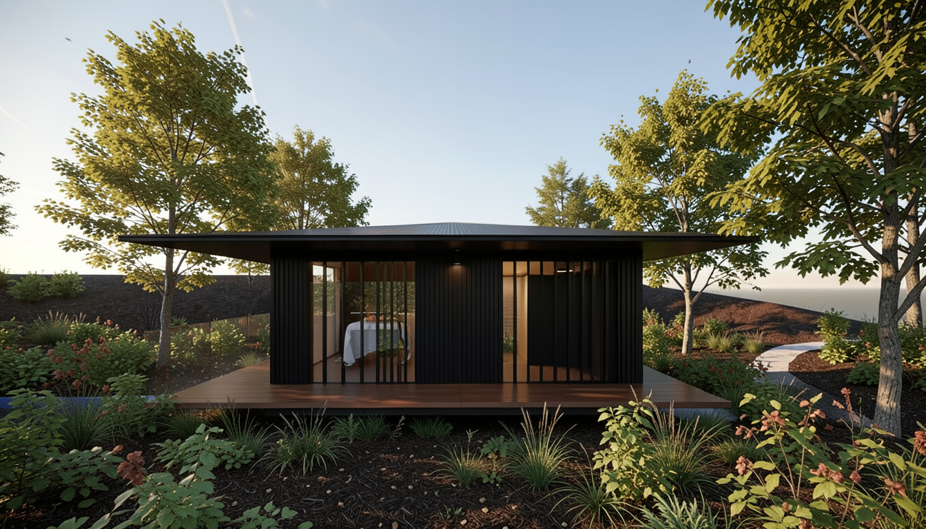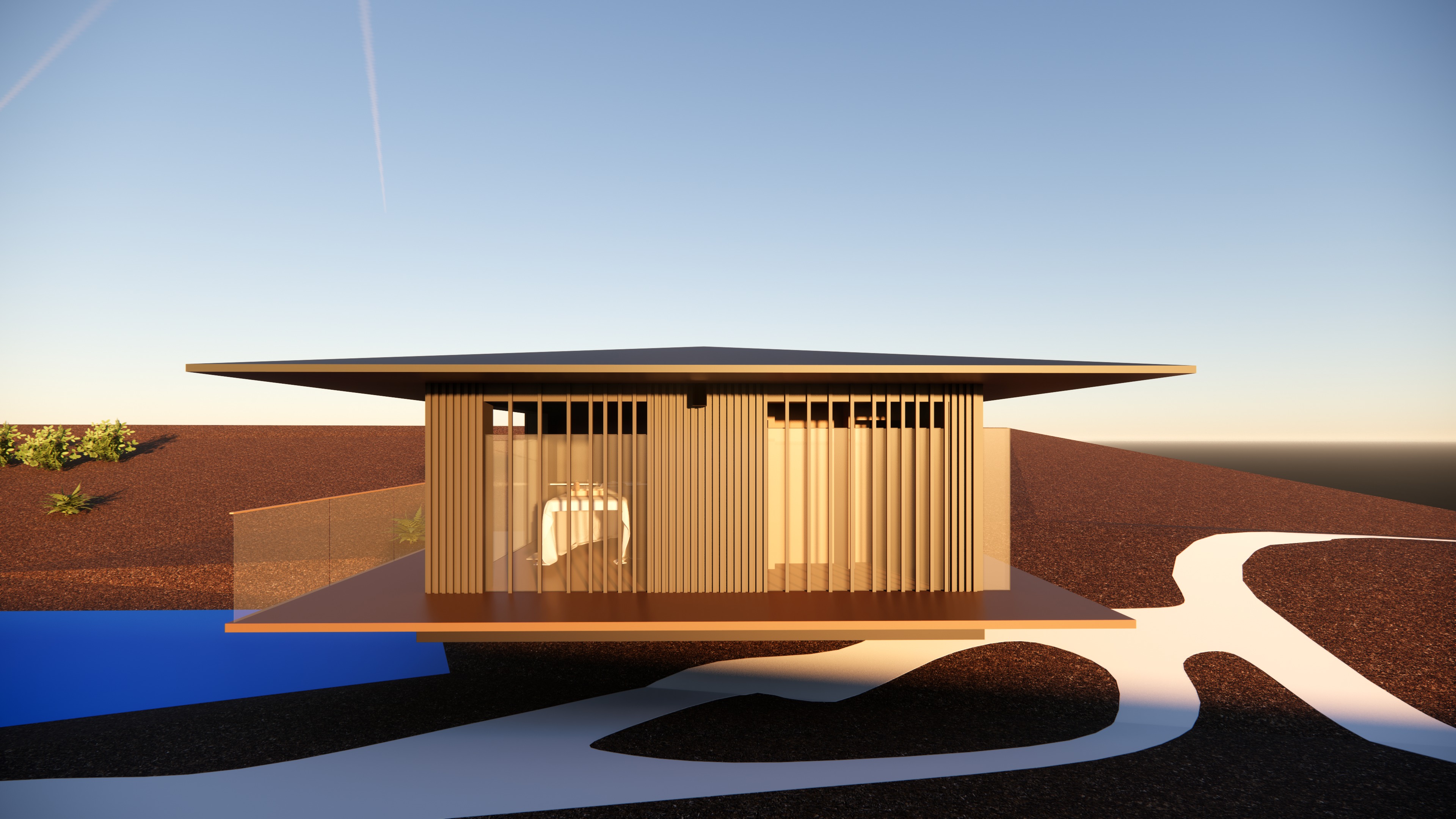 this is a house on top of small pond with small trees in the background the wall material is black burned wood please make it realistic and leave the landscape as it is the ground is dark brown with lush deciduous plants add darmera peltate plants under the house and around water leave the original structure i drawed the extent of the pond area in blue openings are in dark black