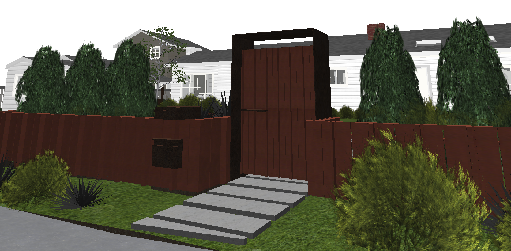 lots of lomandra grasses redwood fence modern rusty steel entry gate portal surround around modern redwood gate to match more tall full bushy hedges modern rusty steel mail box modern rusty steel portal around the gate