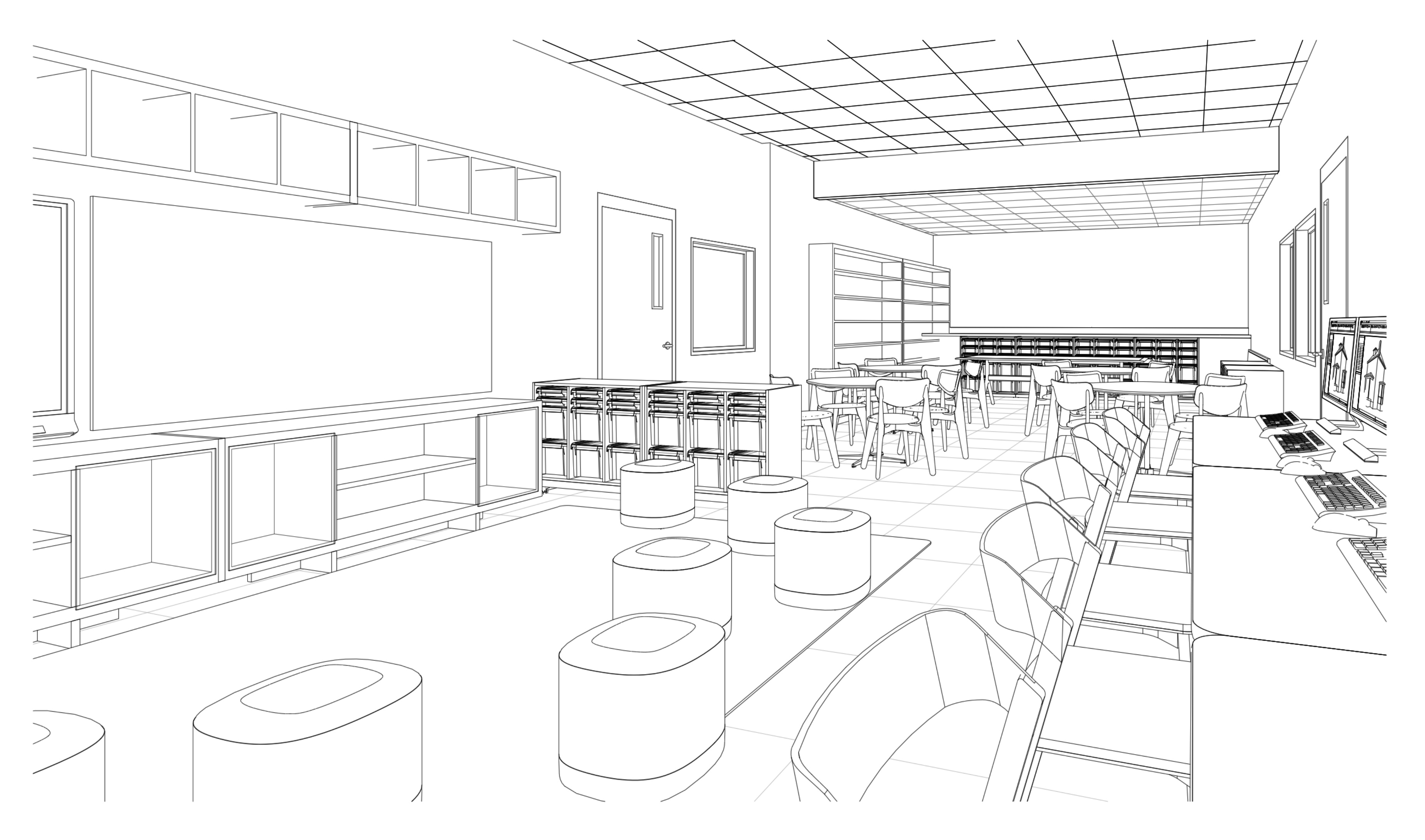modern interior shot elementary school stem space with light wood surfaces pops of blue red and green colors in chairs colorful rug some technology architecture