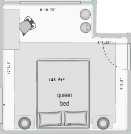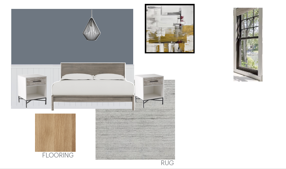 exterior shot use the floor plan as the room layout create a bedroom using the furniture and materials from the mood board place the queen bed centered on the main wall with nightstands on both sides large rug under the bed artwork above the bed window providing natural daylight