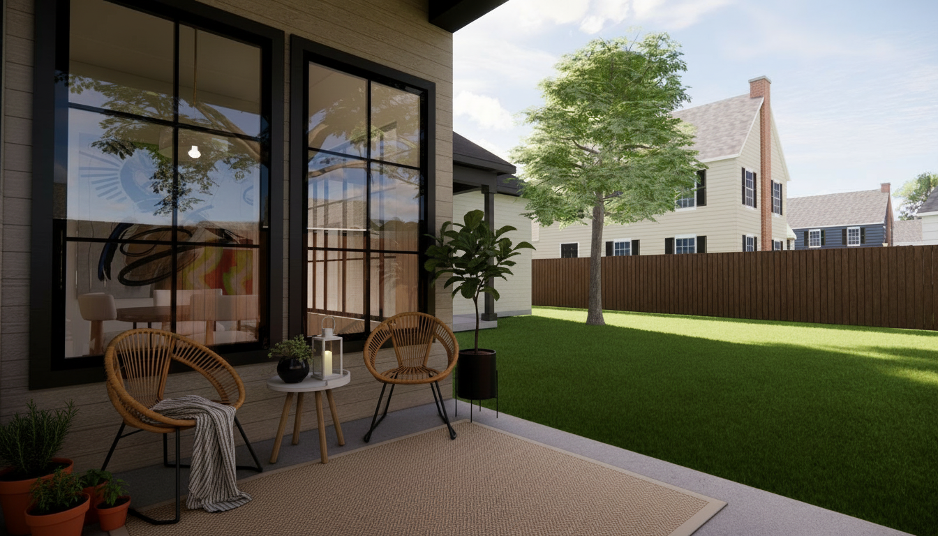 make as photorealistic as possible while keeping textures the same as selection professional landscaping in a lightly wooded scene with good lighting remove the fireplace