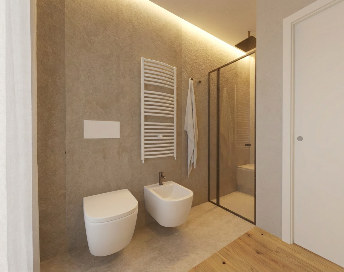 fresh modern bistro interior designed purely as a seating area for approximately 40 50 guests use the provided reference image as the base spatial layout and proportions the atmosphere should feel welcoming fresh contemporary and relaxed walls are primarily clean white plaster one feature wall can use decorative concrete plaster for subtle texture and contrast flooring made of terrazzo ceramic tiles in light natural tones interior palette should stay soft and natural with accents of green seating composed of comfortable upholstered dining chairs combined with small round and rectangular tables arranged naturally across the space include one semi private seating box for approximately 6 8 people designed as a more intimate zone separated by light spatial elements such as wooden slats textile panels or integrated greenery keeping the space visually open but more private lighting design should combine multiple layers modern pendant lights above tables ambient wall lighting soft indirect lighting and decorative lighting elements to create a warm caf atmosphere mirrors can be used subtly on structural columns or selected wall sections to visually enlarge the space and reflect light materials should include natural textures such as light oak wood soft fabrics terrazzo flooring and subtle greenery such as indoor plants the space is intended only for seating and social dining no bar counter should be present style contemporary european bistro scandinavian inspired modern interior warm minimalism elegant but relaxed hospitality design photorealistic architectural interior rendering soft daylight combined with warm ambient lighting wide angle interior view no gree chairs no green chairs