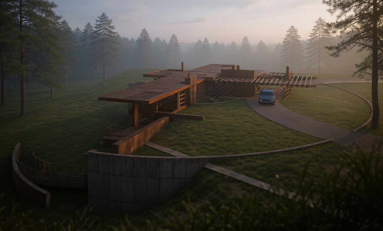 beautiful white stone with hand hewn oak beam work forest context on left with pasture to the right of the deck