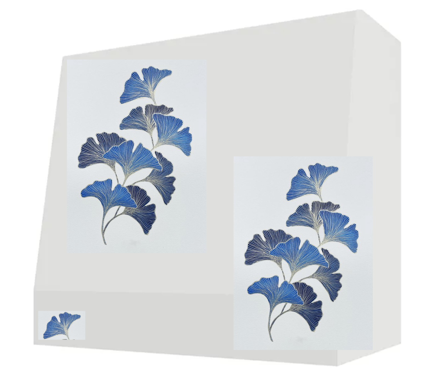 render the kitchen hood with a handpainted style of the blue and white gingko leaves
