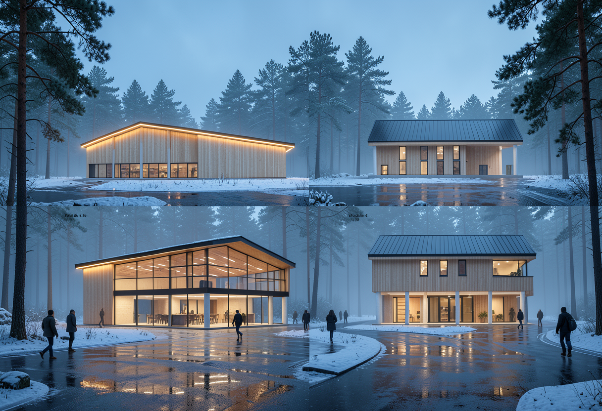use the exact building geometry from the provided elevation drawings do not change proportions roof slope building footprint height or window positions do not redesign or reinterpret the architecture no new volumes no additional buildings no shape modification apply facade treatment only to this exact structure add integrated linear led strip lighting recessed under the roof overhang continuous warm light line along the entire eaves lighting must be hidden and emphasize the cantilever with a glowing soffit light should follow the roof geometry precisely keep facade vertical timber cladding maintain existing glazing layout evening scene in forest context wet ground reflections warm interior light but main focus on roof linear lighting architectural visualization realistic cinematic but accurate to drawings