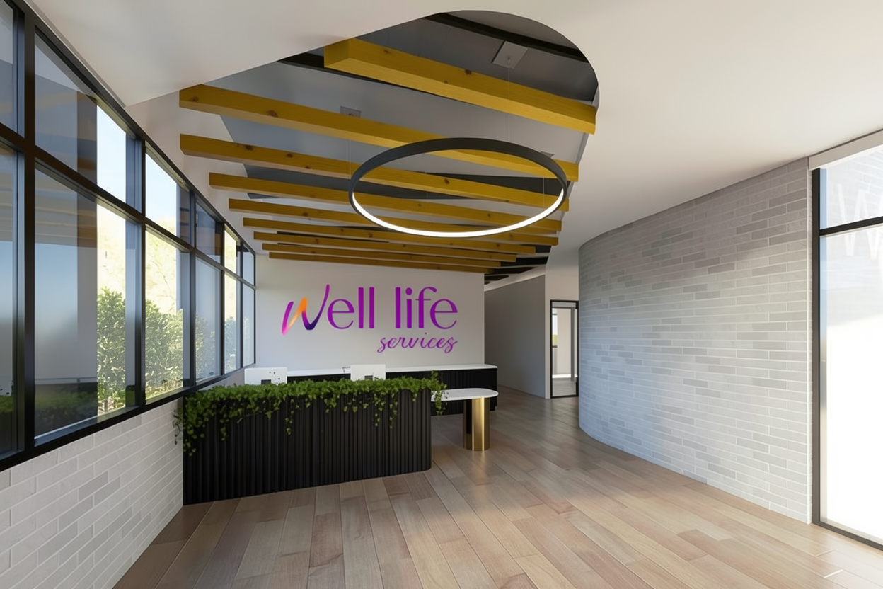 make yellow ceiling battens thinner and more of them closely spaced together add planting to front reception and better lighting black joinery to be a dark blue