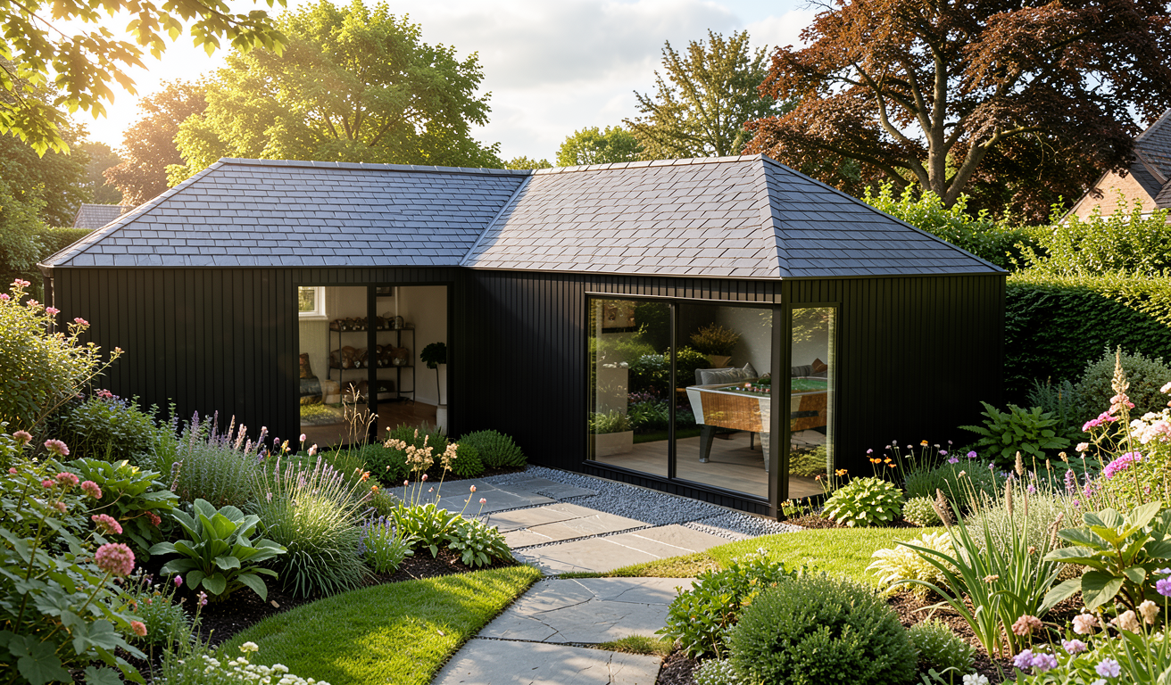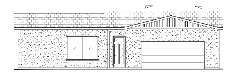 render this adu in a photorealistic image with smooth stucco siding on the gables composite shingle roof and raw wood tone posts nice landscape with a walk way leading to the front door