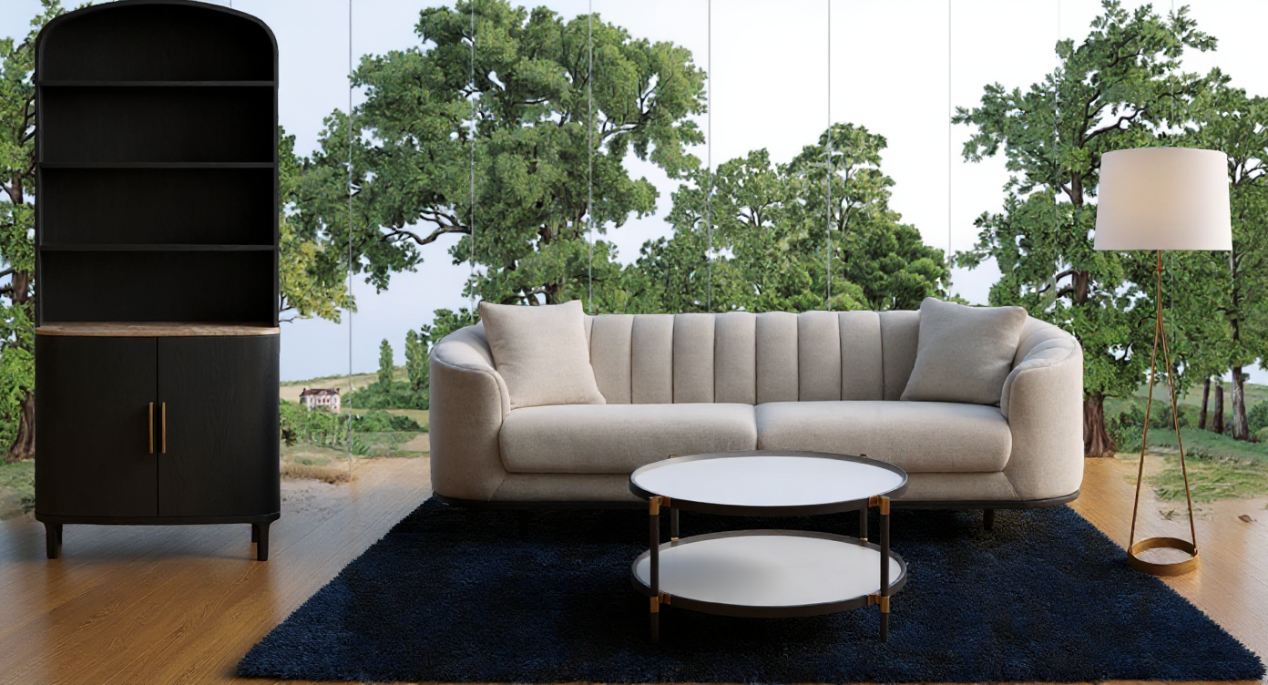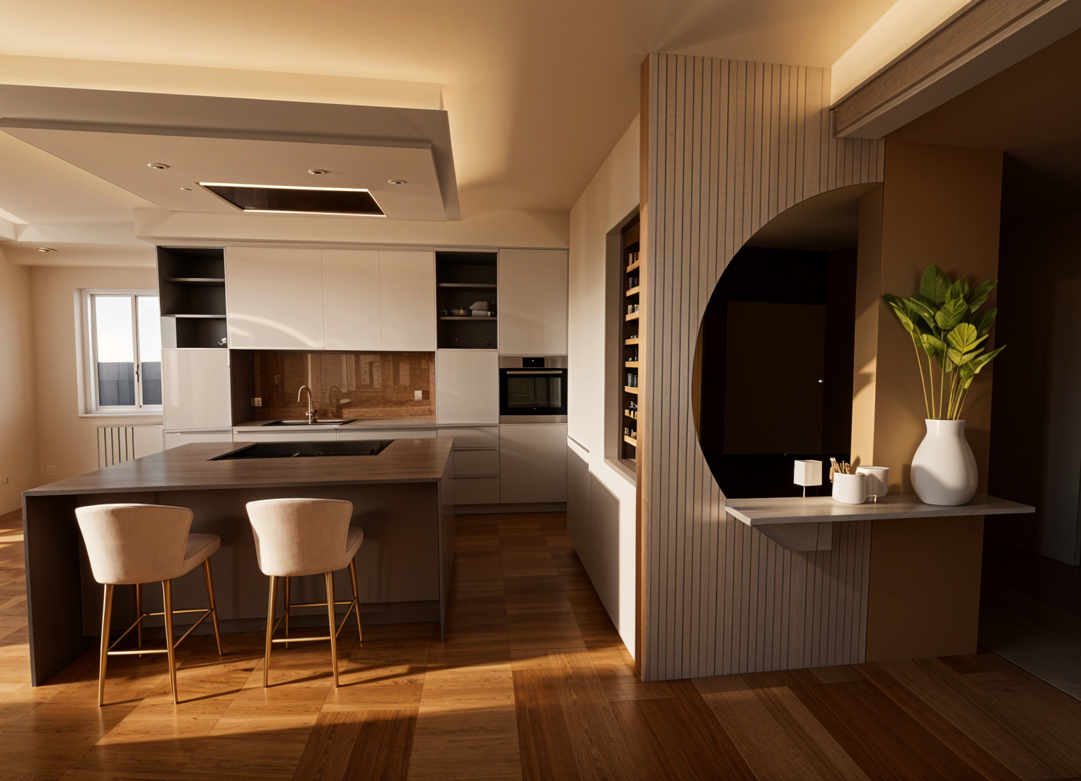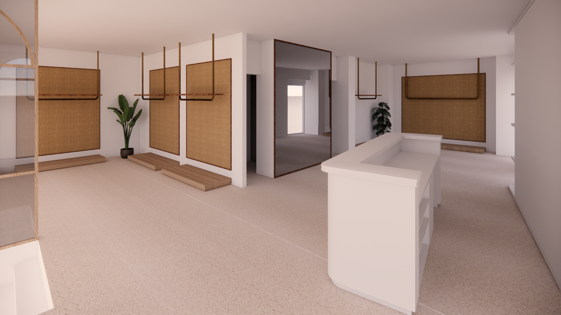 it s a store on the righ side we have a counter keep the original form the panels on the wall have a rattan background with dark timber frame no sun shadows on the floor lime plaster walls white ceiling and synthetic carpet on the floor