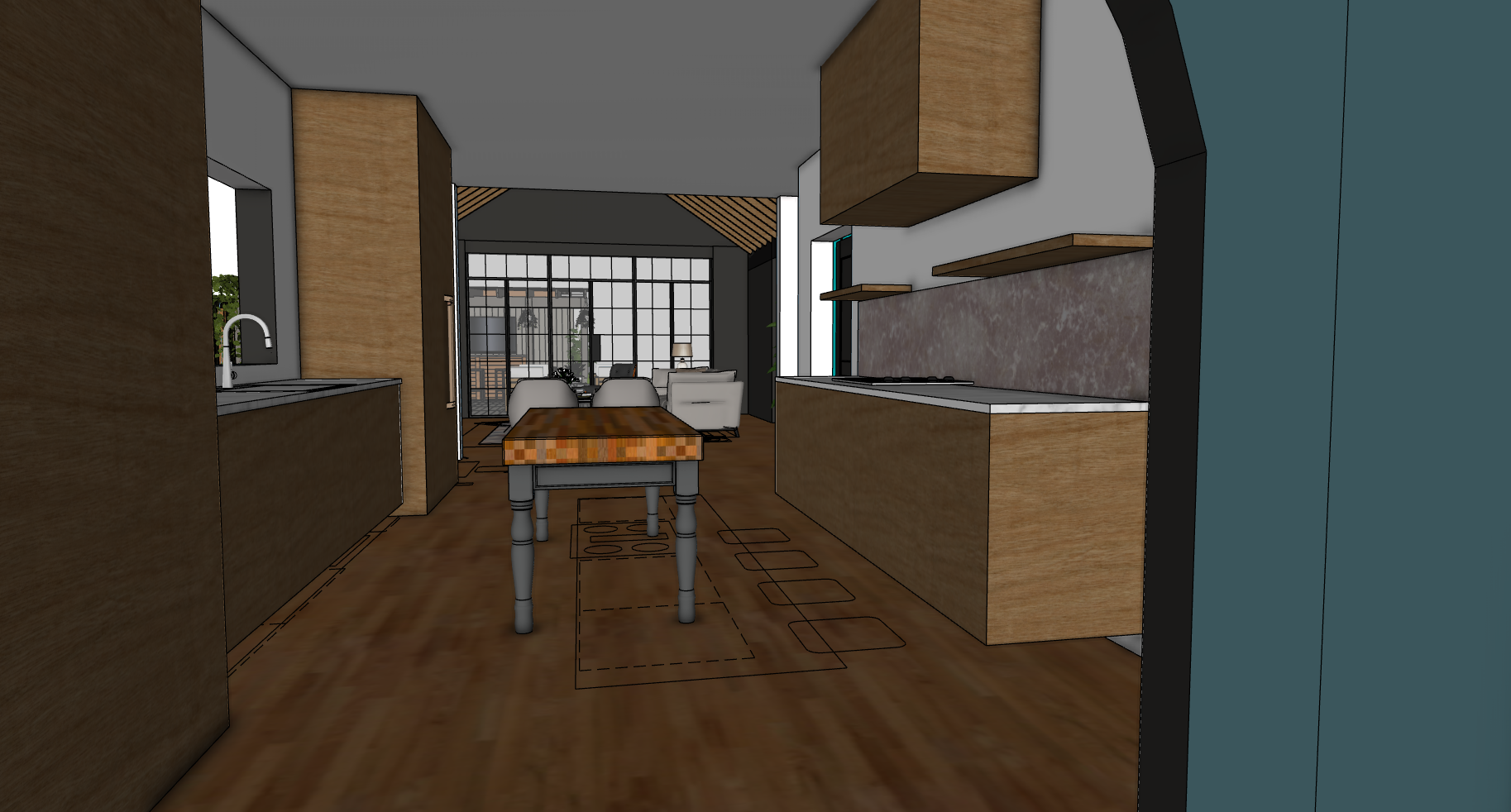 make this a photorealistic rendering of a midcentury modern kitchen with details in the cabinetry and stone finishes on the countertop and backsplash