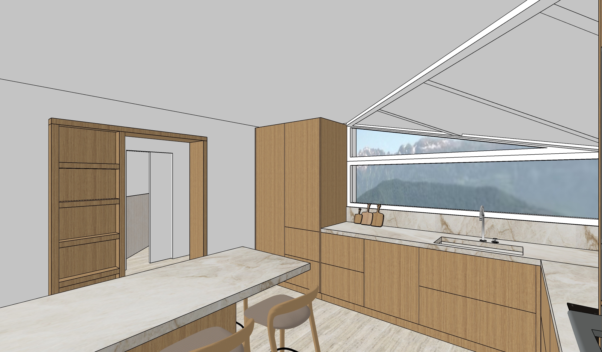 cuisine avec fa ades en ch ne clair plan de travail en quartzite perla venata sol en travertin paysage montagne