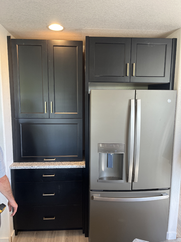 do not change the cabinets in any way preserve the exact cabinet colors materials finishes dimensions door and drawer styles hardware spacing alignment and all geometry exactly as shown do not alter the countertop shape backsplash appliances flooring lighting fixtures or wall structure only remove the construction materials clutter and mess from the scene clean the room and make it look finished and staged add a few simple tasteful home accessories appropriate for the style of the space but do not add or remove any furniture windows or architectural elements maintain the original lighting direction and realism enhance clarity and polish the photo while keeping the cabinetry and room design completely unchanged do not alter the lighting to keep the cabinet colors as they are in the image fix the gap between the uppers add crown molding