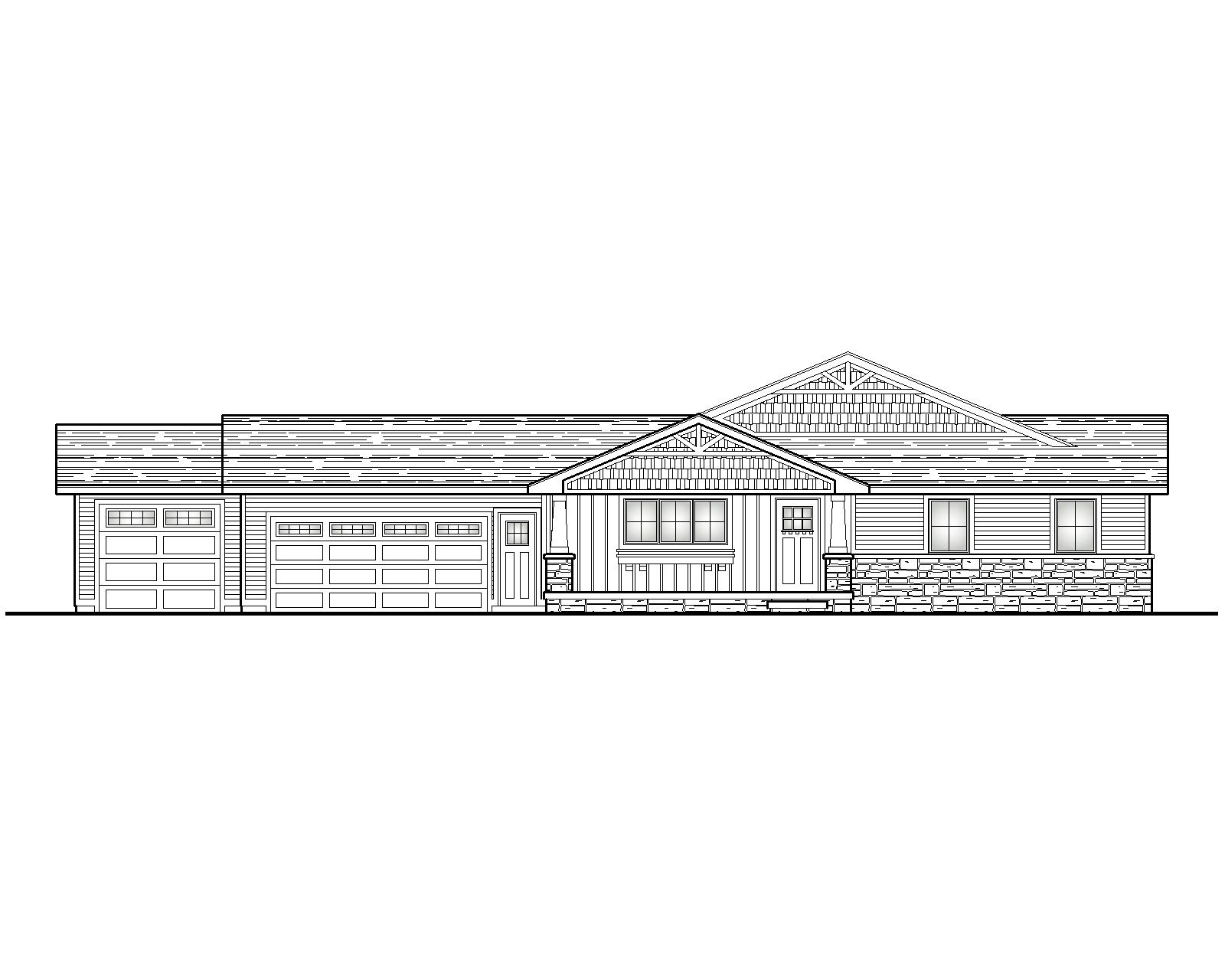 a beautiful modern ranch style house surrounded by lush greenery and a charming front garden the exterior walls are painted in a soothing light gray with white trim the roof is a soft slate gray complementing the elegant stone accents on the fa ade the garage doors have a natural wood finish adding warmth to the design in the foreground vibrant flowers in red yellow and purple line the pathway leading to the front door the atmosphere is serene and inviting with a clear blue sky overhead and soft warm sunlight casting gentle shadows