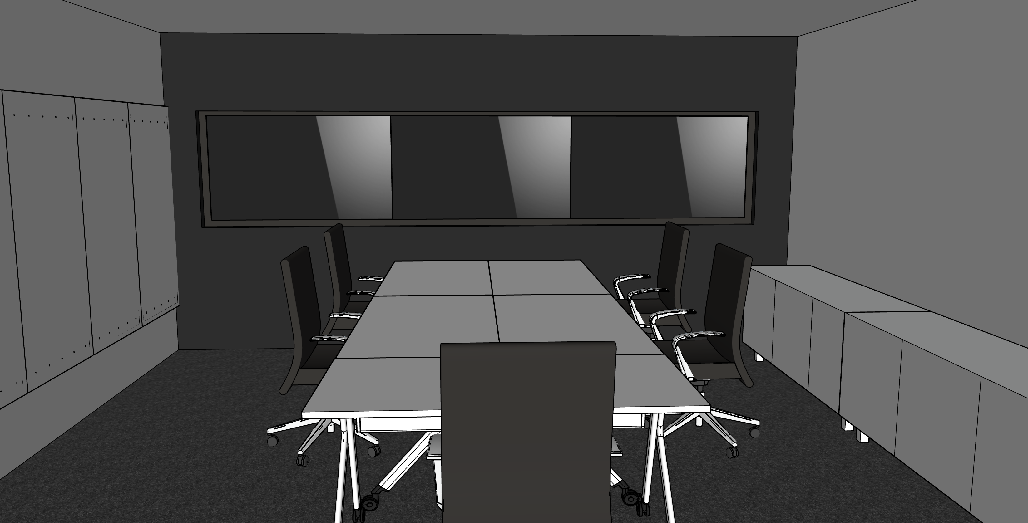 this is a war room in a sleek and moder office the tv screens have a subtle backlit glow behind them the table tops are white the white boards are glass the chairs are leather with chrome arms the consoles are white the walls on the right and left are white but the back wall in dark gray as shown in the image