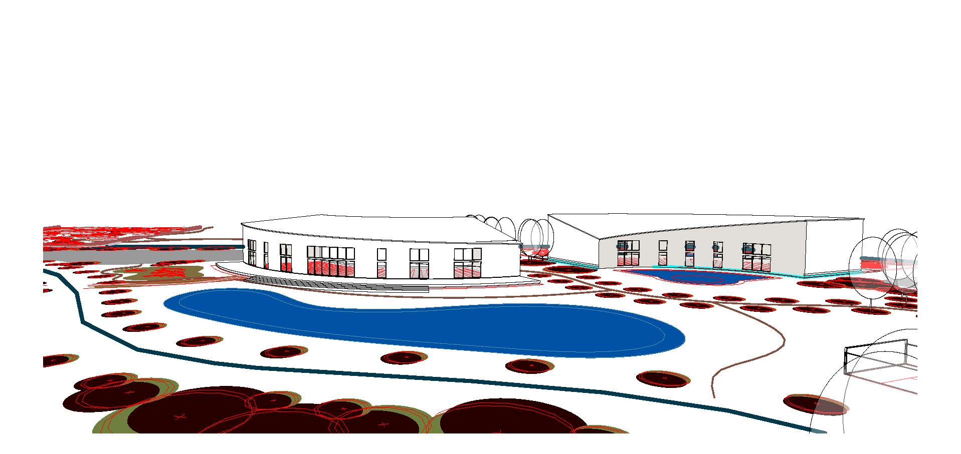generate a serene architectural render featuring two curved buildings with timber cladding and large glass windows the left building will have a roof terrace which overlooks the lake with the terrace sat at the front of the building surround them moved lawn and strategically placed clusters of trees incorporate a tranquil pond in the foreground to the left of the image with its blue water reflecting the sky and paddleboarders on the pond add pathways with vibrant flowerbeds create a warm golden sunset glow to enhance the peaceful atmosphere casting soft shadows across the scene