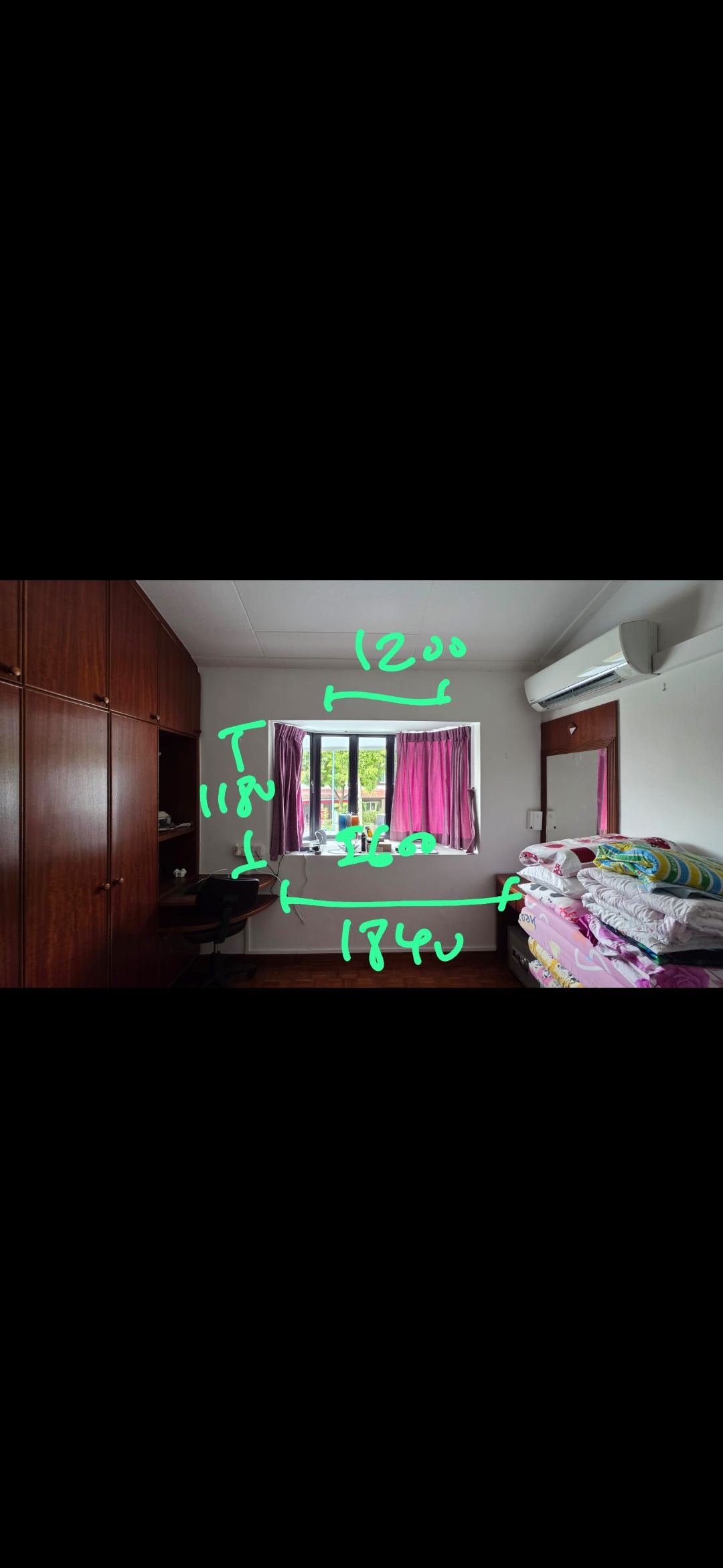 modernist interior shot a cozy well lit room adorned with smooth wooden cabinetry in rich mahogany finish the window framed by elegant purple curtains lets in soft sunlight creating a peaceful ambiance a comfortable black office chair sits beside a dark wooden desk on the opposite side a neat stack of colorful linens rests on a bed evoking warmth and comfort the air conditioner is sleek and modern adding a touch of sophistication the overall atmosphere is serene and welcoming with natural and wooden tones harmonizing beautifully architecture