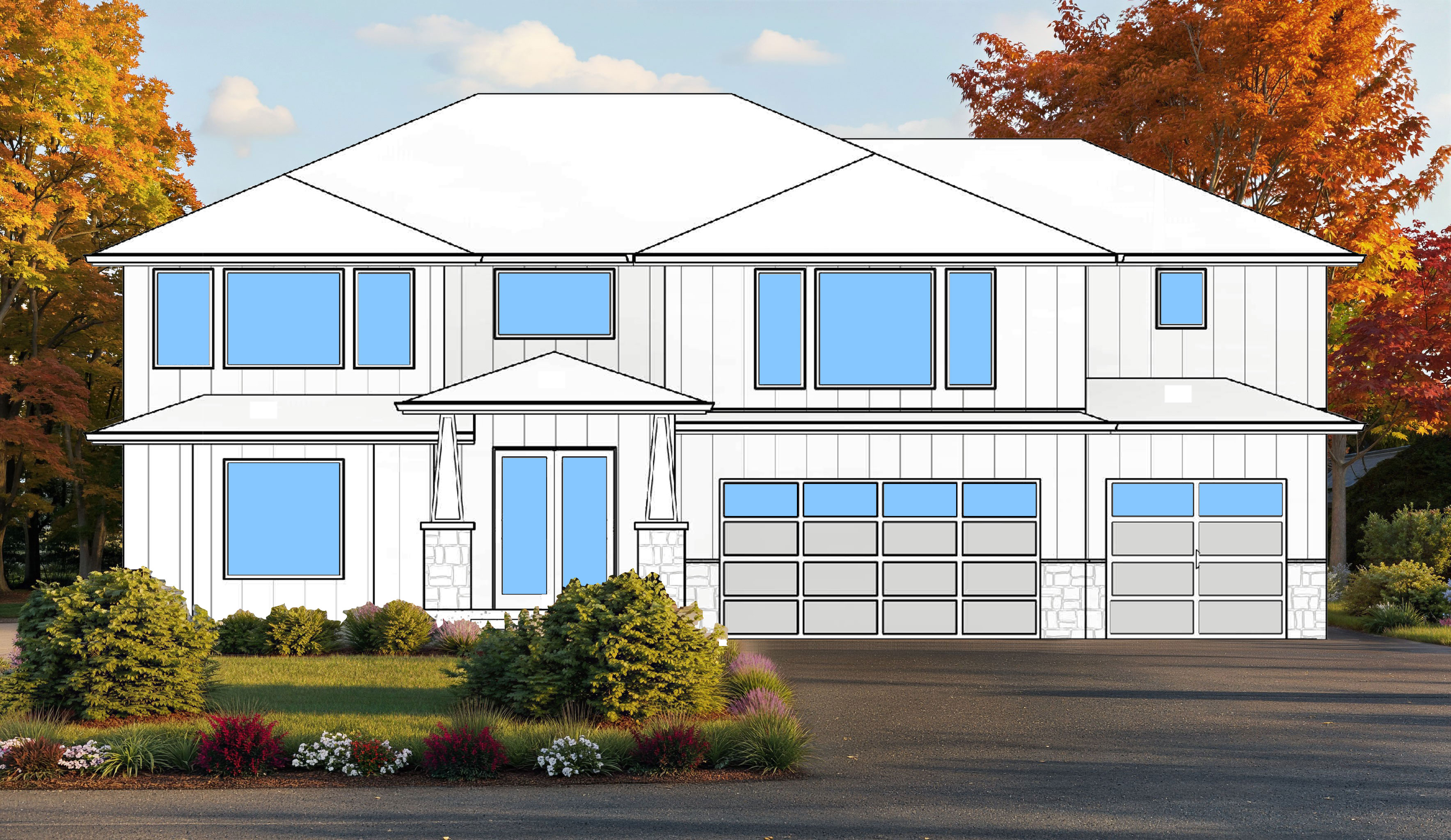 render a modern two story house with a sleek design the exterior walls are painted in a soft white color to give a clean and contemporary look the large windows have a reflective glass shade of light blue enhancing the modern aesthetic use a medium gray for the garage doors to provide a subtle contrast surround the house with lush vibrant green bushes and plants interspersed with pops of red and white flowers for added color the sky is a soft blue dotted with fluffy white clouds setting a bright and cheerful atmosphere the backdrop features trees with rich orange and red foliage creating a warm and inviting autumn ambiance