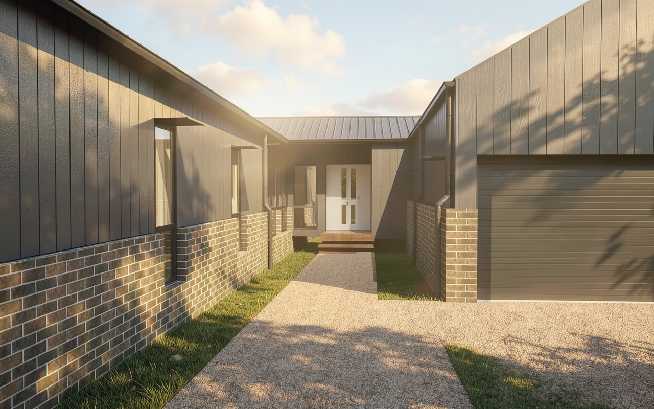 a manicured lawn layered native ferns shrubs small black boys beds low maintenance shrubs native plants stone pathway leading to the entrance connected to a stamped concrete driveway to garage door ghost gum and stringybark eucalyptus trees in background people fancy glazed entry doors