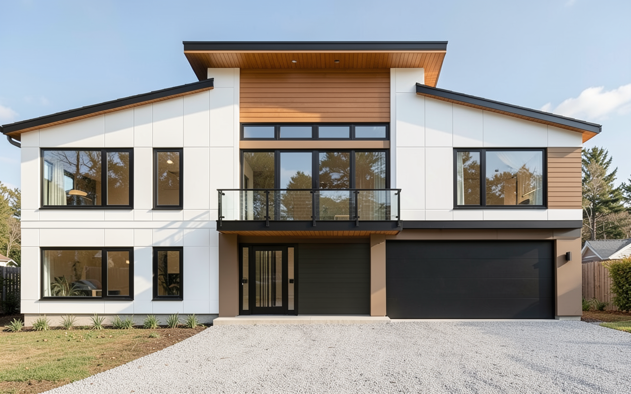 modern elevation in white smooth hardie panel lux westcoast series colour fawn on outside of upper and lower windows and right side of front door soffit is wood black window frames and garage door in black glass deck rail in centre of upper floor with posts prominent belly band on deck in black remainder in white