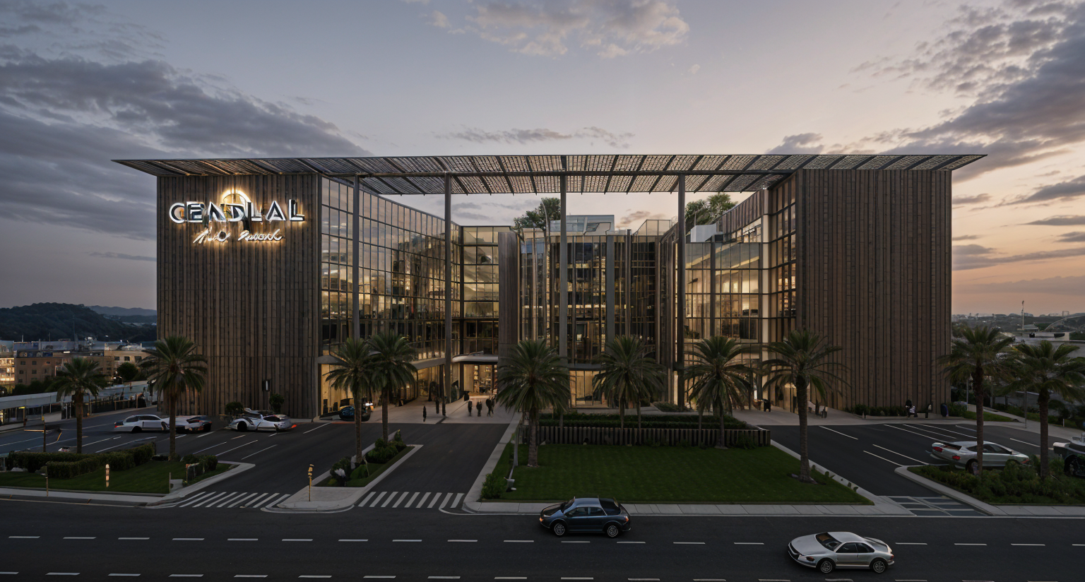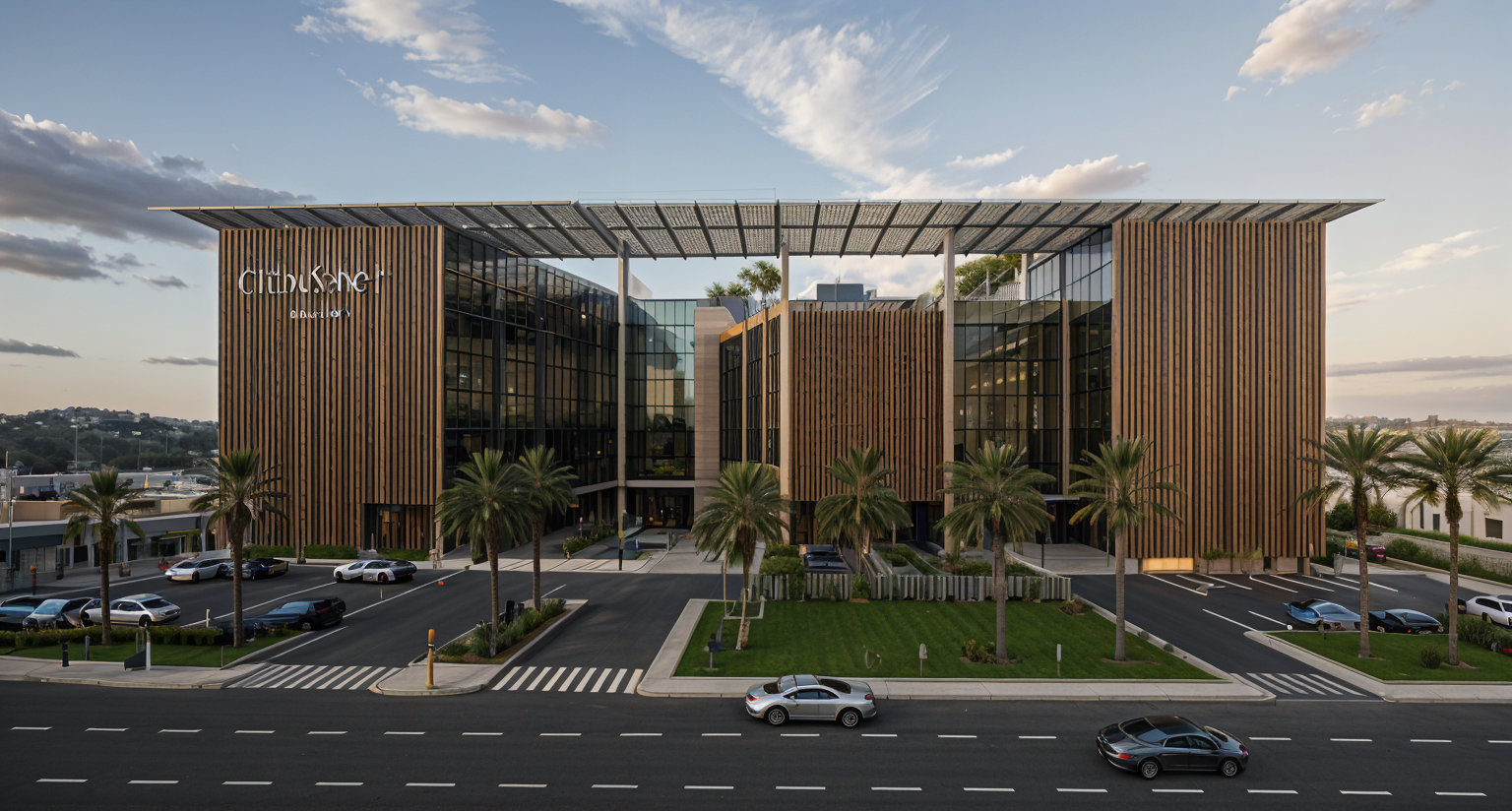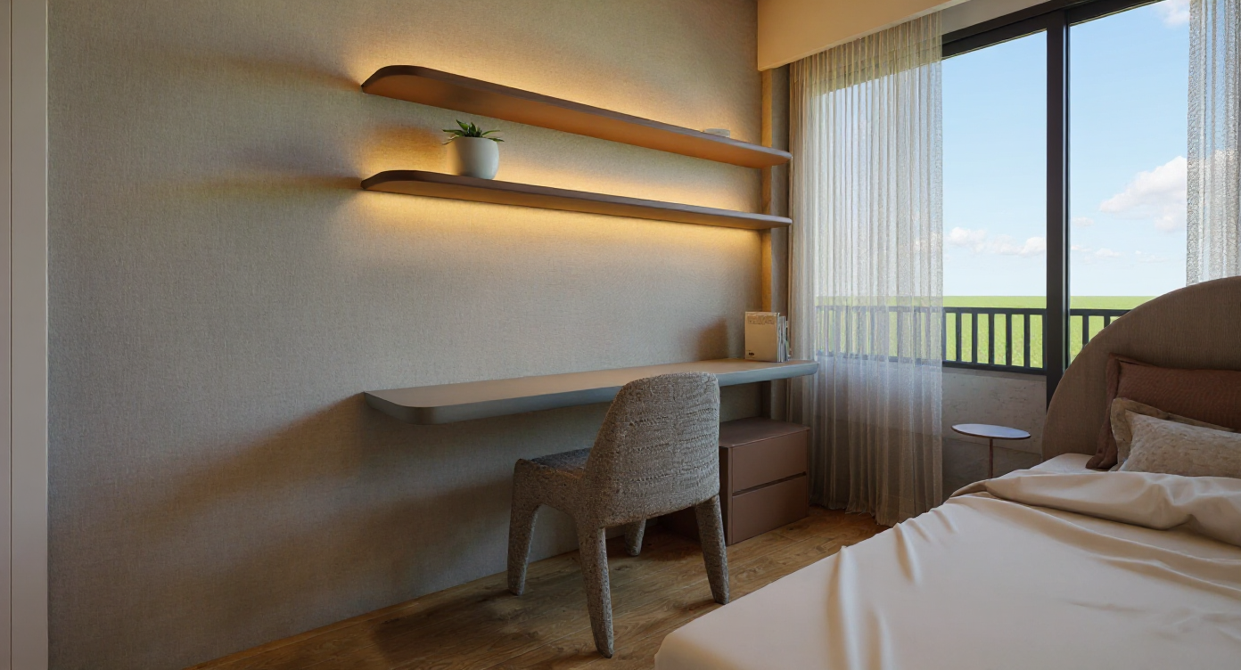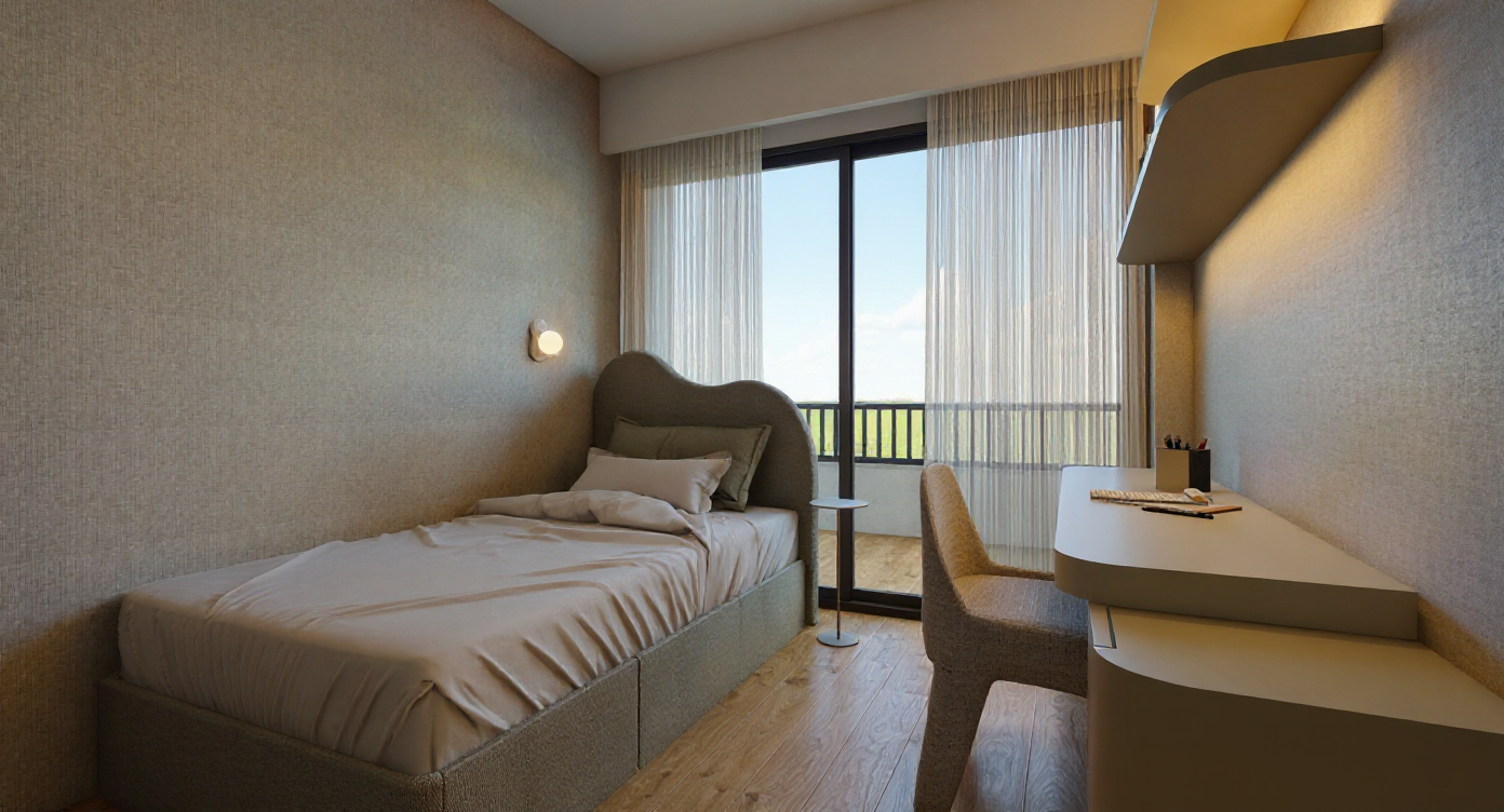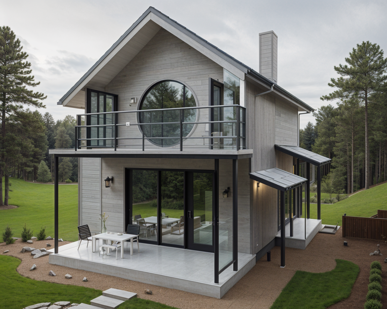 realistic render cloudy sky trees in background manicured lawn simple shrubs