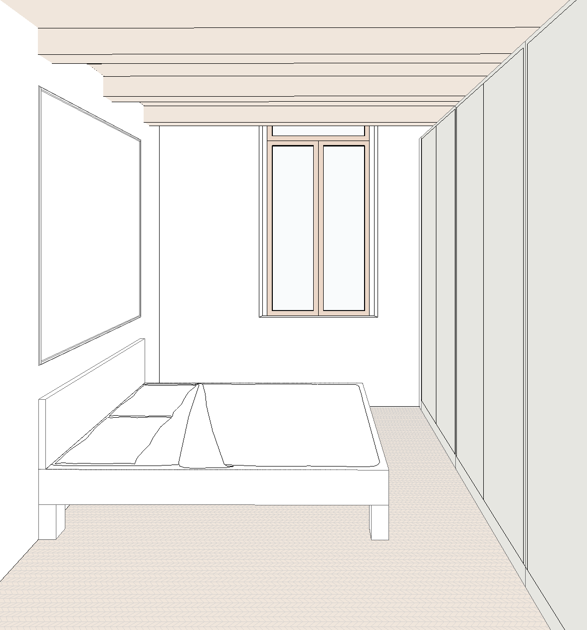 crea un render fotorealistico a partire da questa vista e una camera da letto sulla destra ci sono armadiature moderne a tutta altezza sulla sinistra c un letto comodo con testiera alta e due comodini moderni sopra ai comodini pendono due lampade moderne il soffitto in travi in legno a vista il pavimento un parquet a spina ungherese