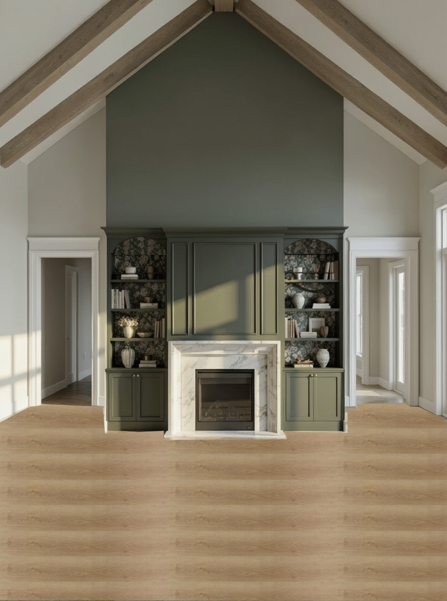 living room fireplace with marble mantel on extended wall all of the green wall is at the same depth wood flooring in an offset horizontal pattern lots of natural light coming through the windows and doors