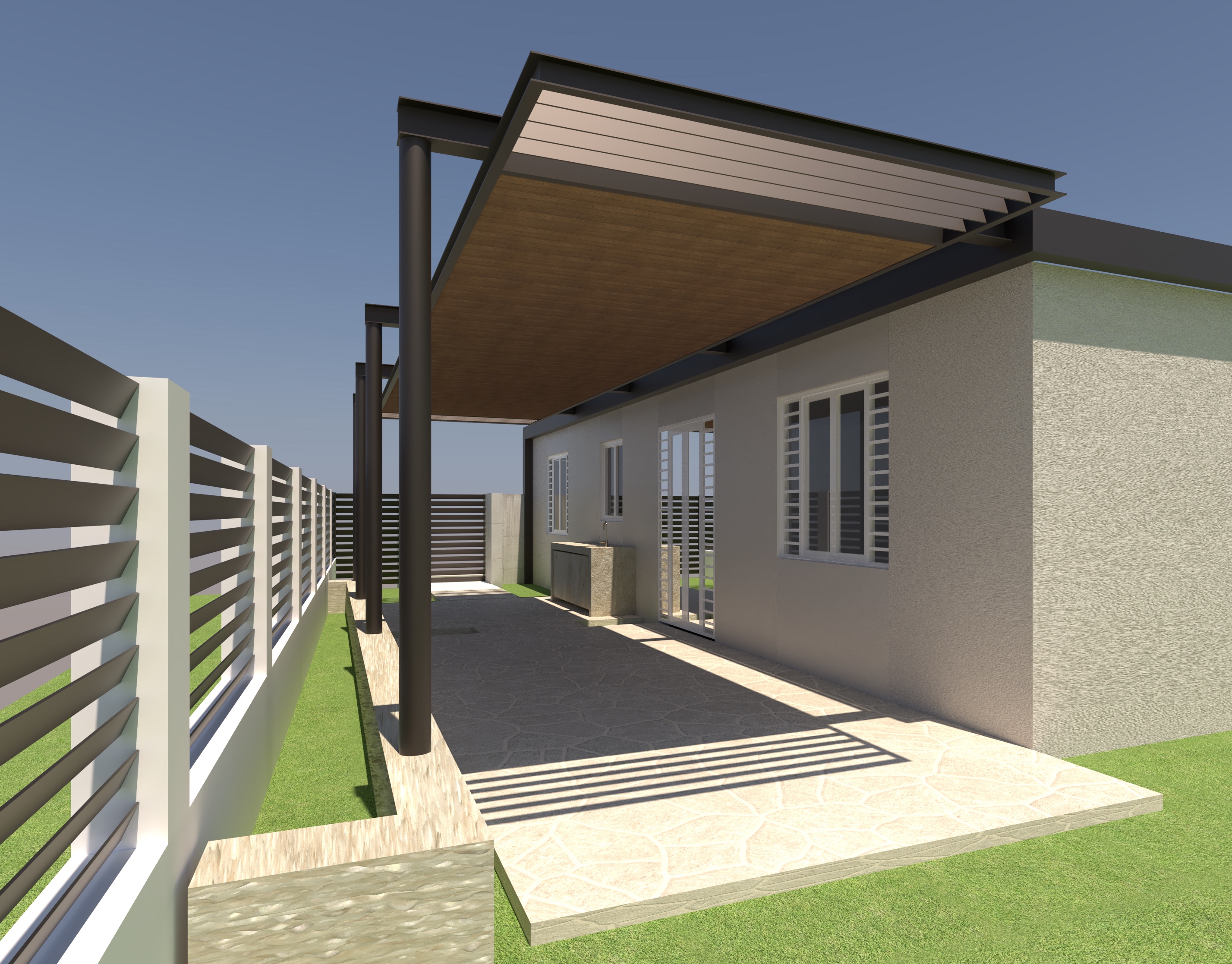 add sexy lighting tropical landscape but keep materiality and architecture add plants to left side planters make it photorealistic
