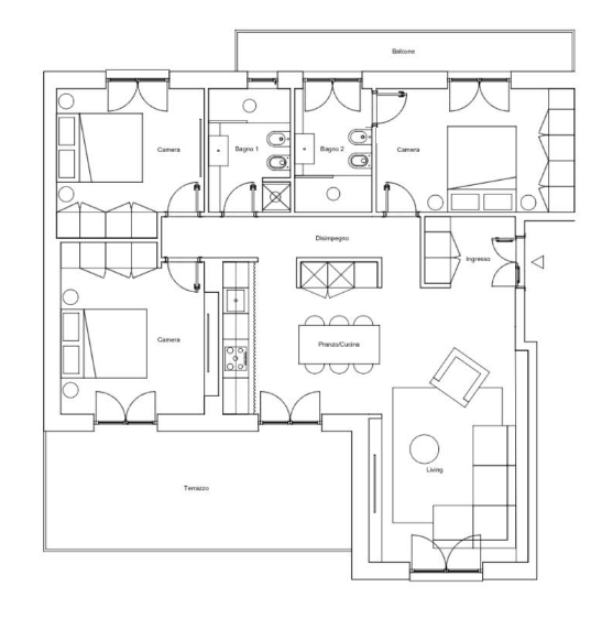 convert this floor plan into a realistic isometric 3d view of a full house show the space from an elevated angle with furniture walls and details visible usa colori tenui parquet a spina in rovere naturale e travertino nei bagni use the same furniture as shows on the plan do not change the orientation of the floorplan