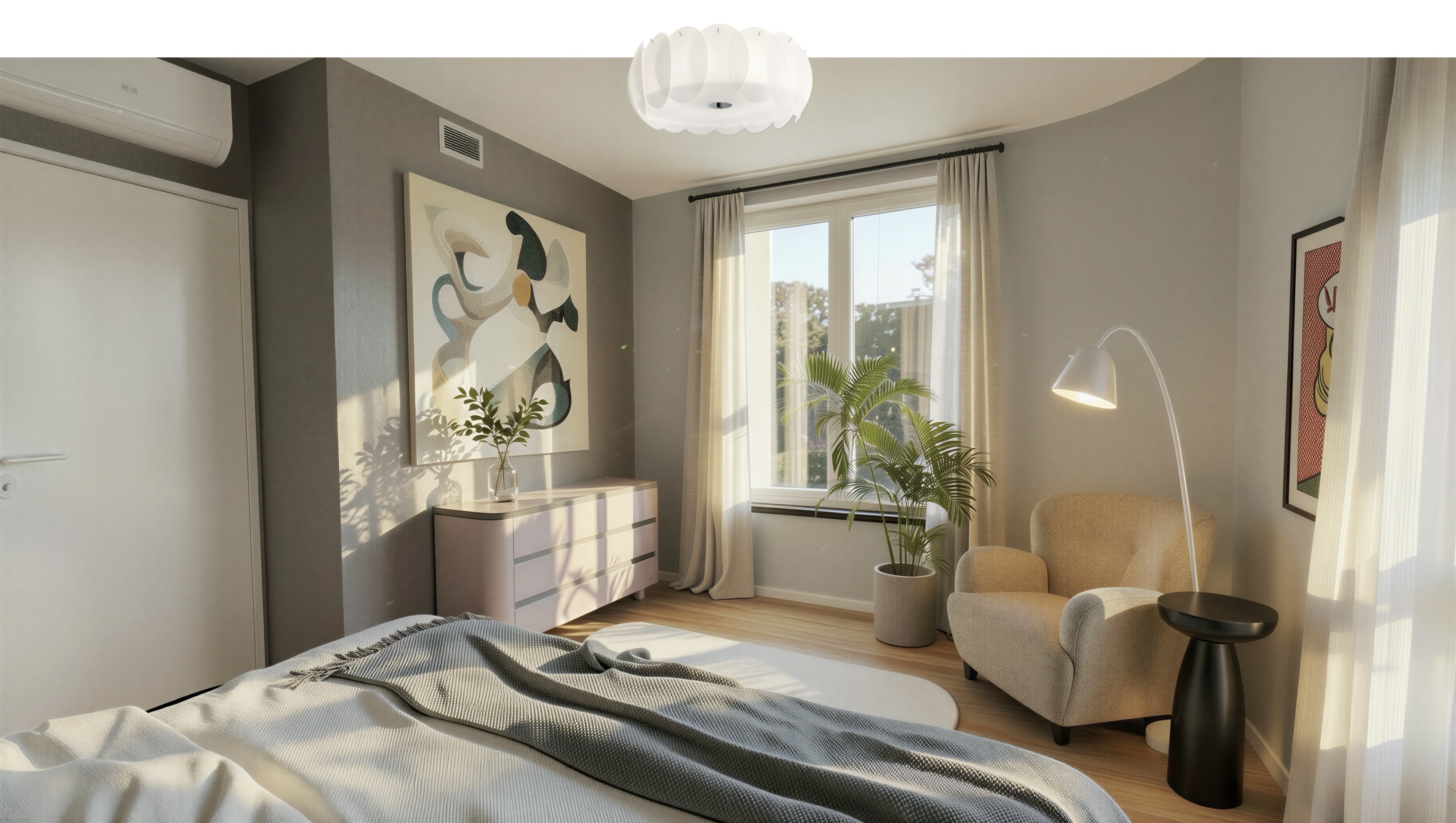 a photo of the bedroom interior from image 0 png depicting the same layout furniture and art but with all distinct light spots and dappled sunbeam patterns removed from the surfaces the scene is illuminated by a clean smooth diffused ambient daylight that fills the room evenly without creating harsh shadows or defined sun patches the gray wall the light pink dresser the floor the abstract artwork and the bed sheets are all rendered with uniform consistent lighting the textured armchair black side table white floor lamp turned on with its own soft localized glow ceiling light window view and curtains remain in place with the curtains showing soft even light filtration all original details and objects are preserved but the overall feel is one of soft consistent and uniform diffused daylight without any specific solar light spots