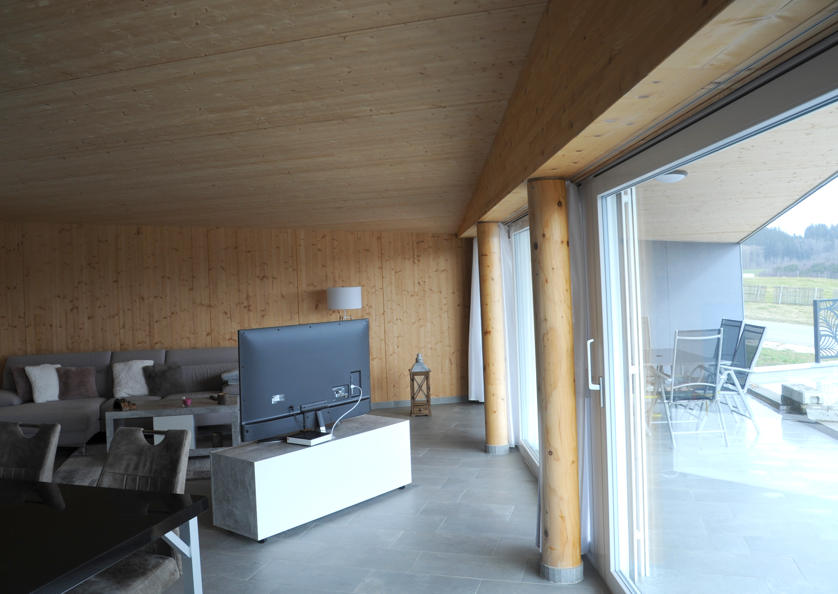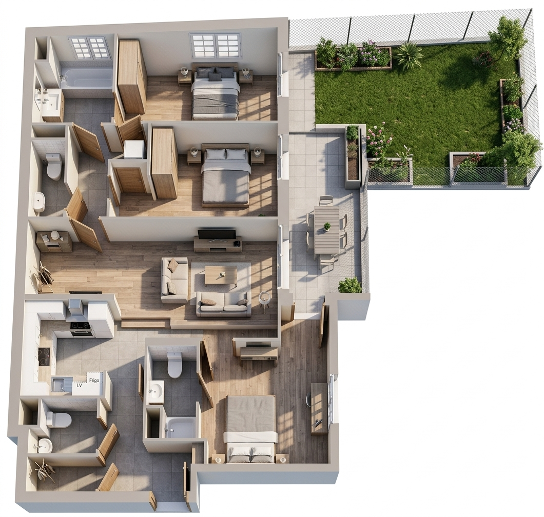 strictly edit this image keep the walls architecture layout camera angle and strictly preserve the original image format and aspect ratio do not crop resize stretch or reframe the image the final image must match the original format exactly required changes must be clearly visible remove all baseboards completely no baseboards anywhere including along walls and around columns remove the tv and tv cabinet completely remove the exterior barrier completely replace all interior furniture with elegant simple high end vitra style furniture minimalist clean lines neutral tones add a subtle neutral living room rug beige or light grey minimalist design add 1 or 2 indoor plants specifically monstera type plants large leaves modern decorative look furniture constraints use a 2 3 seat sofa minimum no single seat sofa or armchair as main seating furniture must look refined cohesive and high end strict rules do not ignore do not modify the walls do not change structure or layout do not crop zoom or change framing in any way do not keep any baseboards do not keep the tv or tv cabinet do not keep the exterior barrier do not leave any traces of removed elements do not use bulky cheap or mismatched furniture