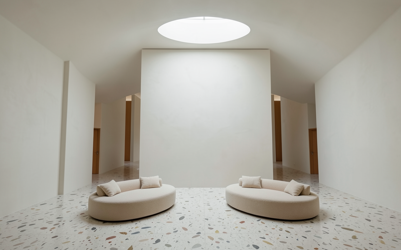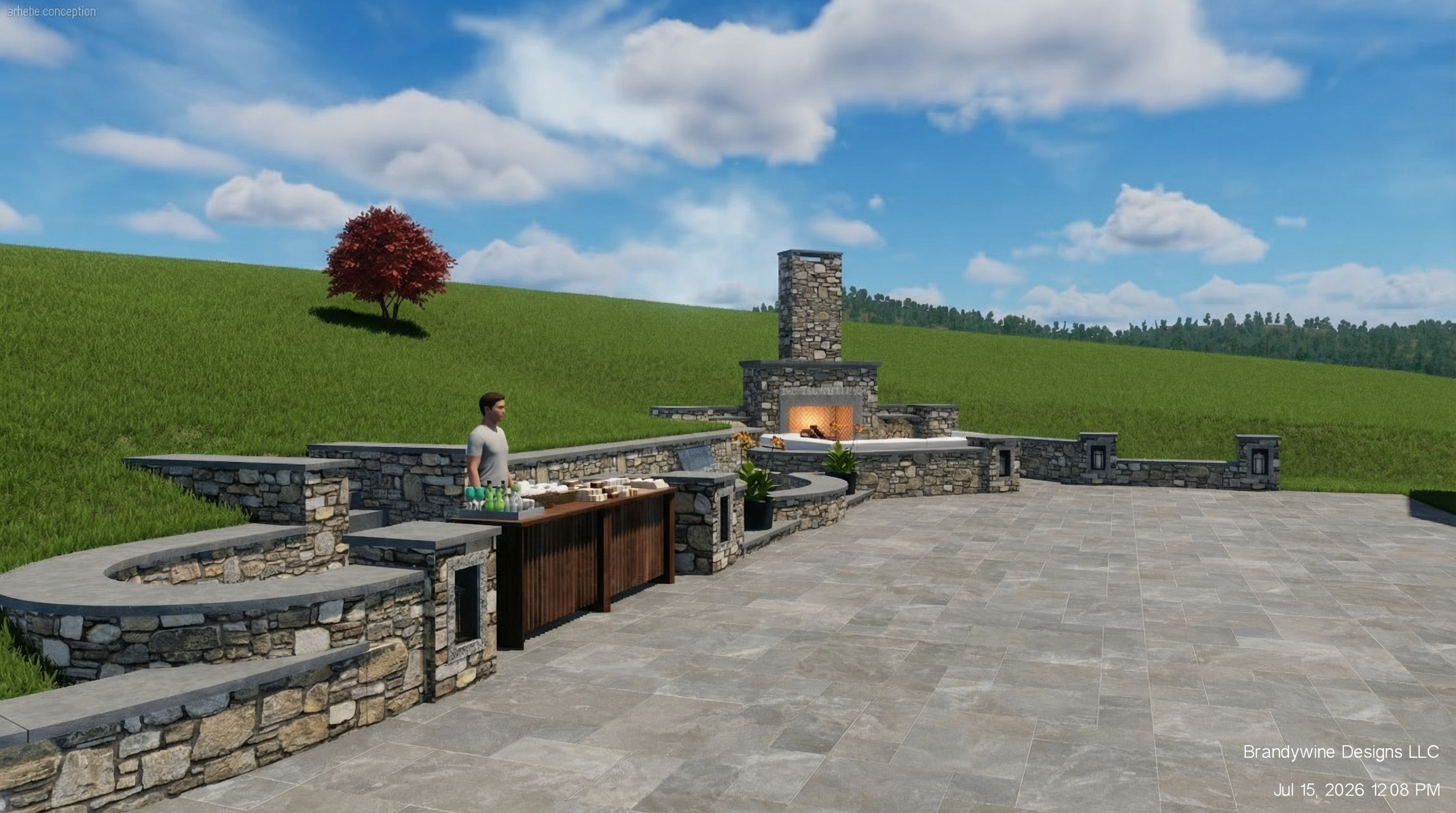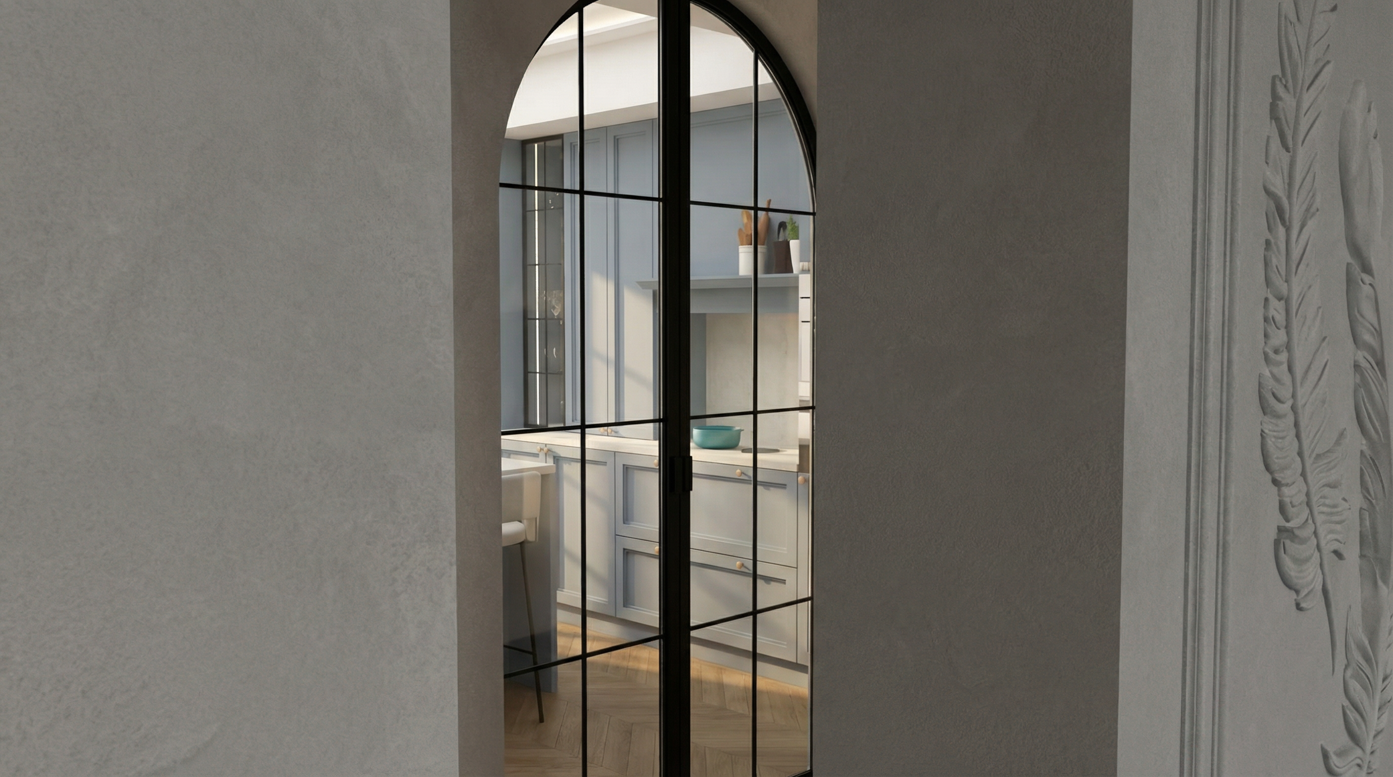 maintain all geometry and material colors create a hyper realistic sunny morning interior rendering this is a second floor room facing south so the view out of the window should reflect that the painted casework should be a semi gloss finish the wood casework should remain as wood with a gloss finish the sconces should be lit in a 2700k temperature and a soft glow the ceiling should be a matt paint finish show a couple square can lights with brass housings on a dim setting there should be a can light in the shower the room beyond the cased opening should be lit with natural light from the right side by a window that isn t seen the square object above the vanity beyond the cased opening is a mirror show a shower curtain held open to one side behind the arched opening
