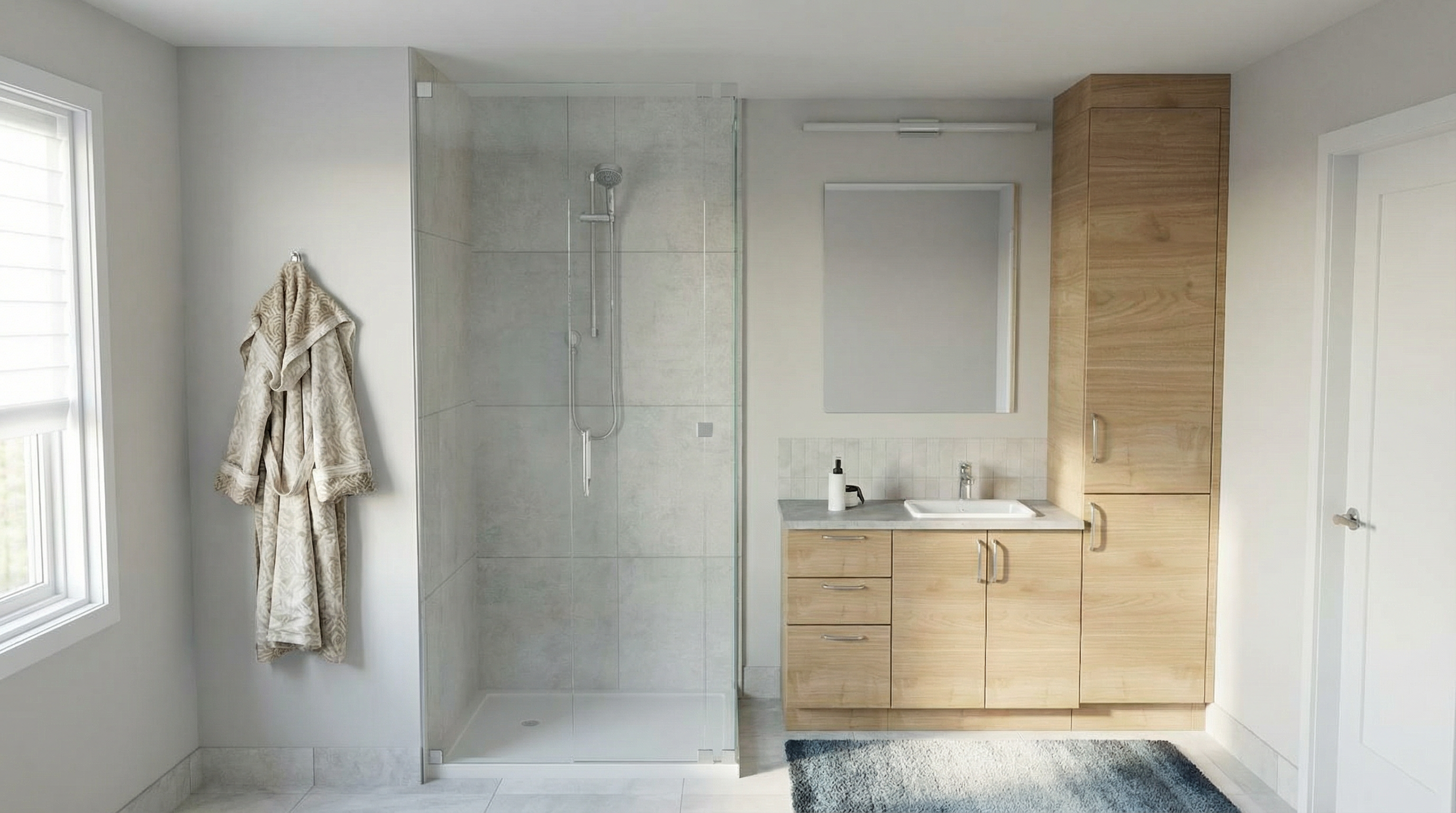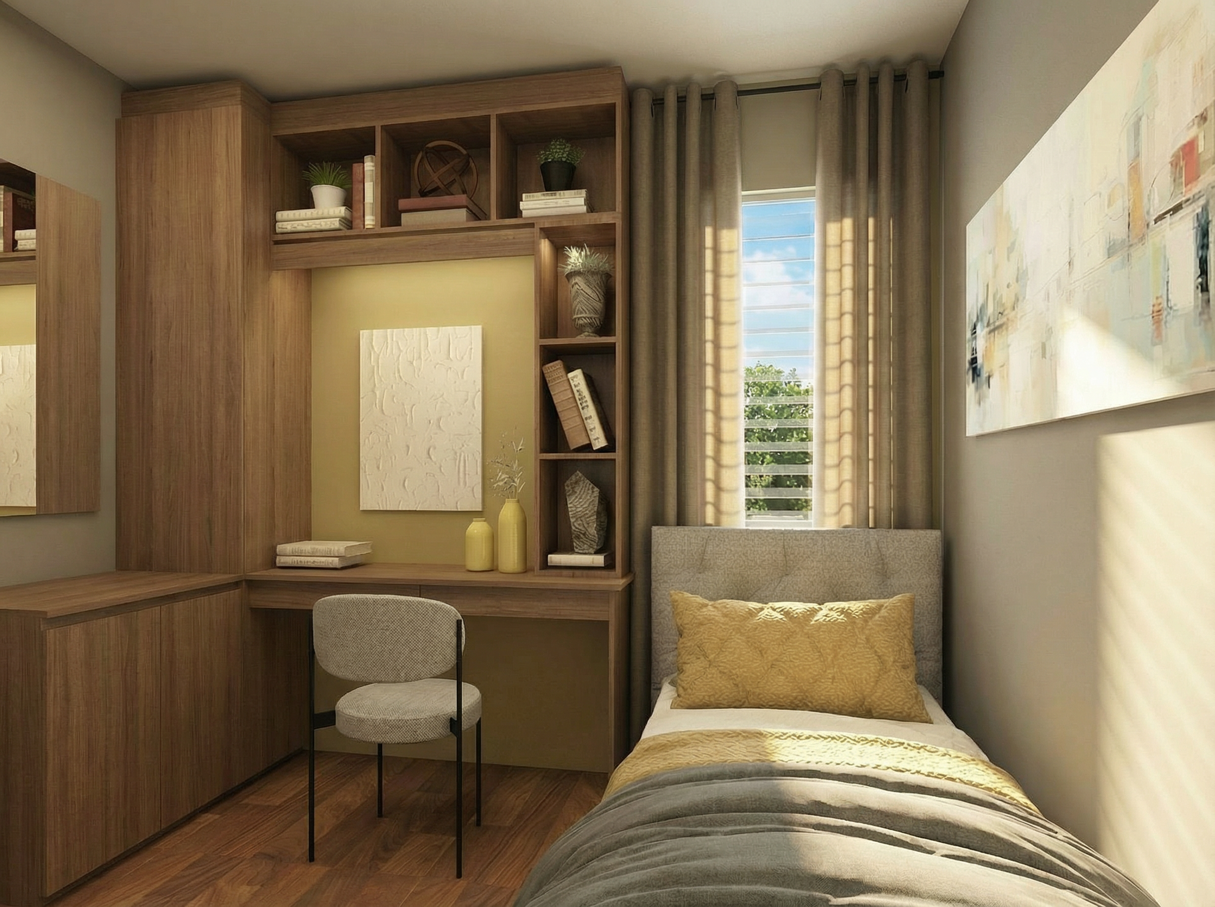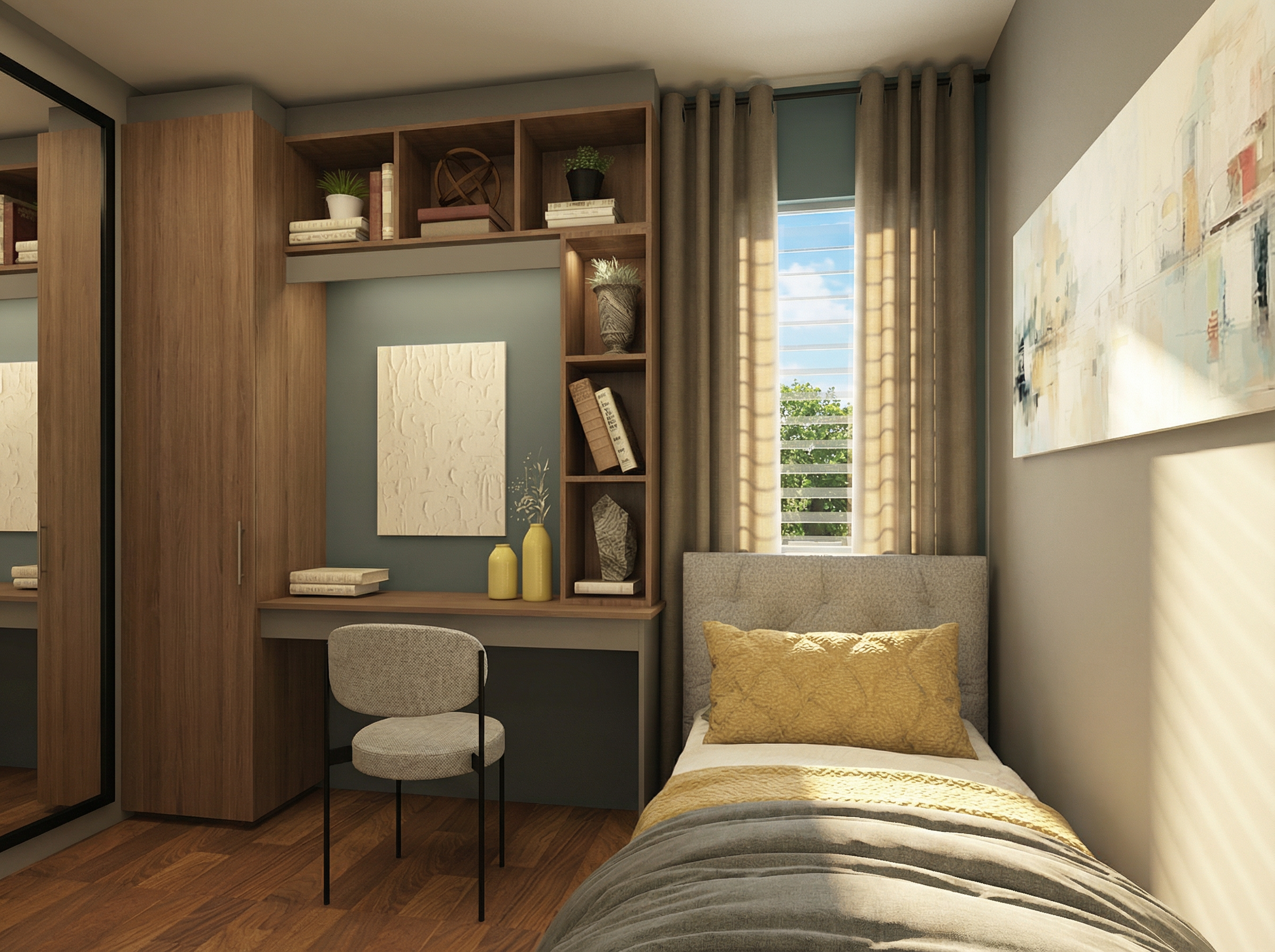 change teal colors to dull de saturated yellow maintain all other details make the mirror on the far left side 75 shorter