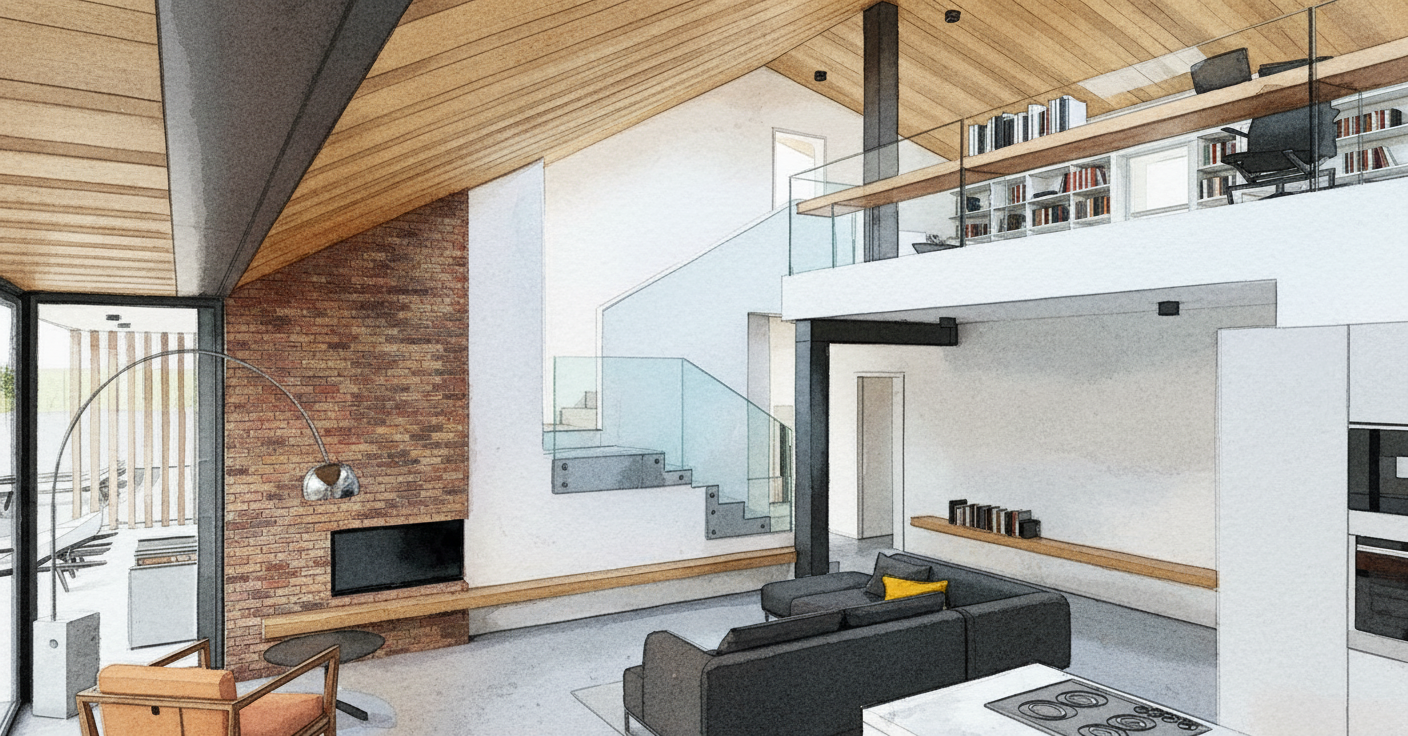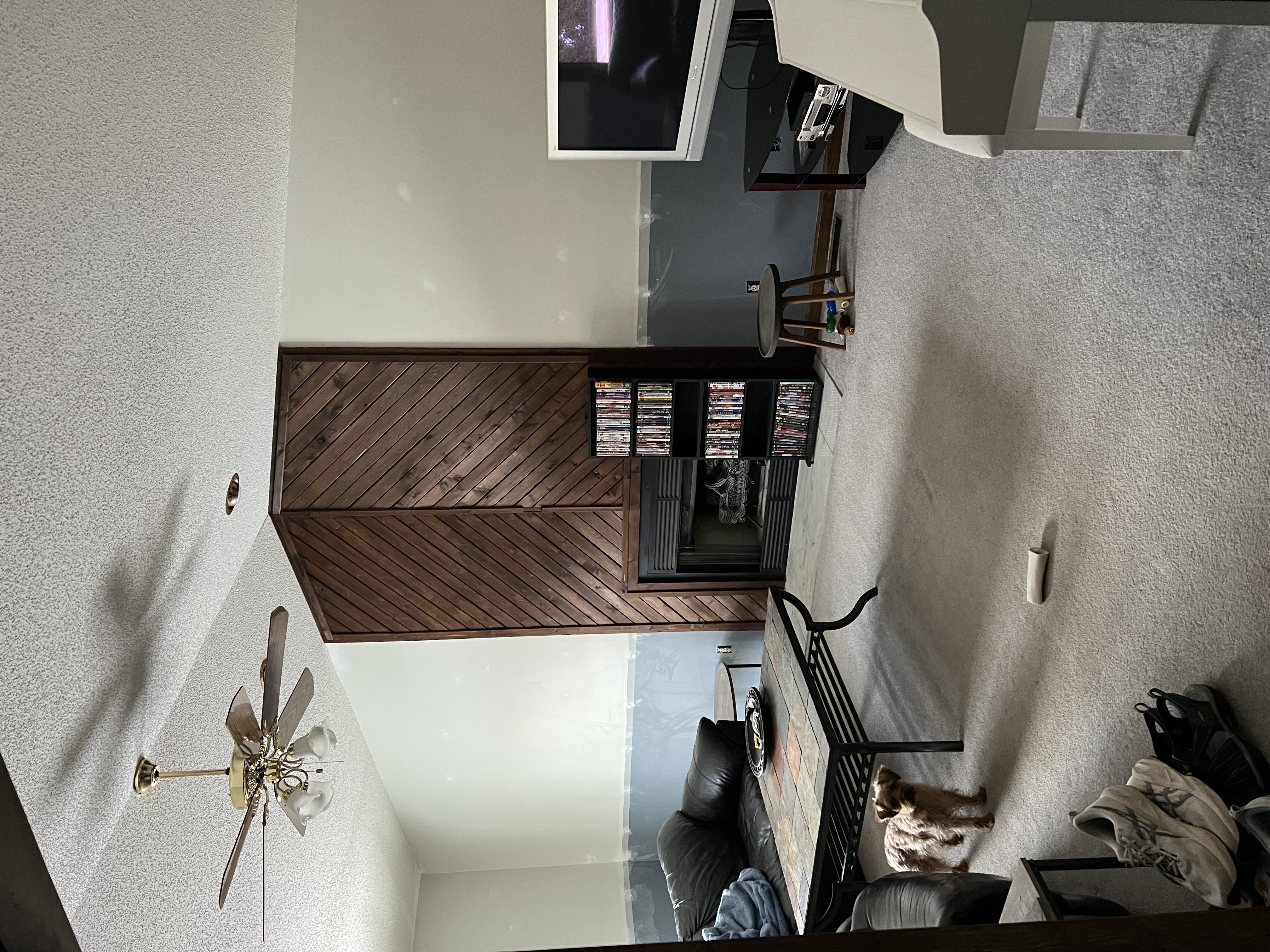 new urbanism interior shot a cozy living room with modern rustic charm featuring a rich wooden accent wall around a sleek black fireplace the ceiling is a soft white with a gold and wood ceiling fan walls are painted in white and dark brown a cream sectional is paired with a sophisticated coffee table with a wood accents accent room with distressed steel art a fluffy tan carpet complements the warmth of the room the lighting is warm and inviting creating a tranquil and homely atmosphere add subtle hints of greenery for freshness architecture