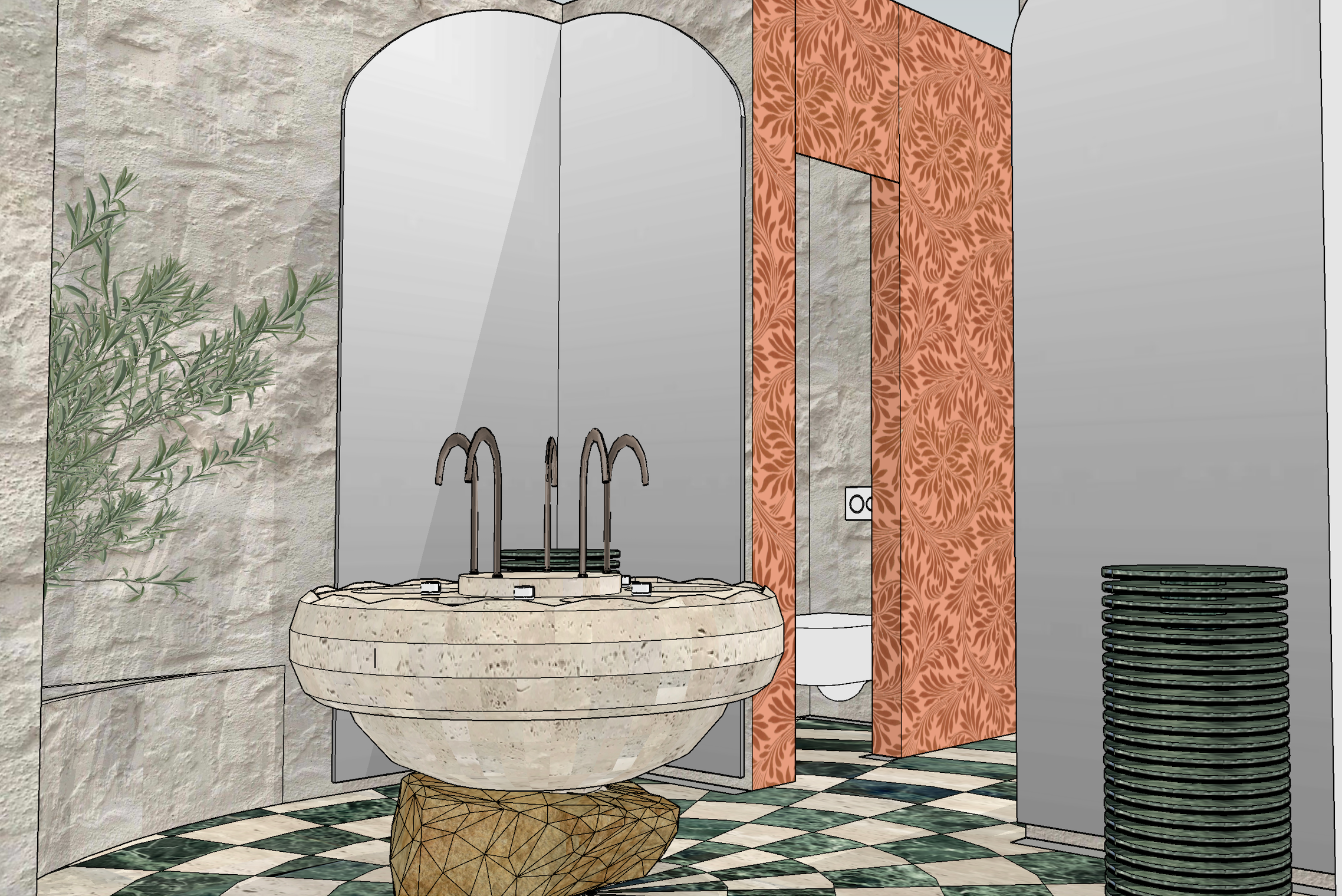 modernist exterior shot luxurious bathroom with a rustic elegance featuring a large stone basin sink on a textured marble block stand the walls have a rough light beige rough stone texture giving a natural and earthy feel a lush green plant adorns the side adding freshness the floor consists of a radial checkered green and cream marlbe tiles the room includes a patterned terracotta accent wall for a pop of color sleek metal taps provide a modern contrast the atmosphere is serene and spa like with soft natural lighting architecture