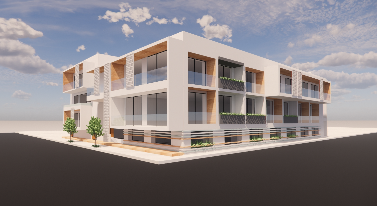 take this building and enhance it but keep the general modern look a manicured lawn layered flower beds low maintenance shrubs native plants stone pathway leading to the entrance
