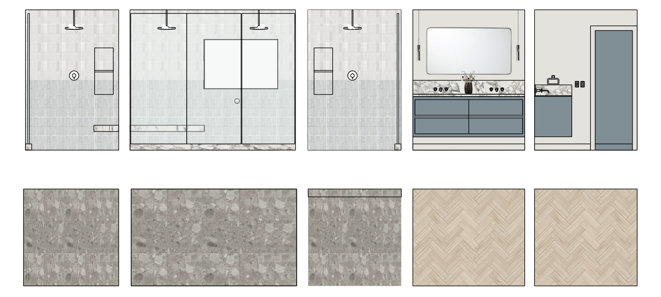 the bottom half of the shower walls are light blue subway tile and the top half white subway tile the plumbing fixtures are polished chrome and the marble is arbescato