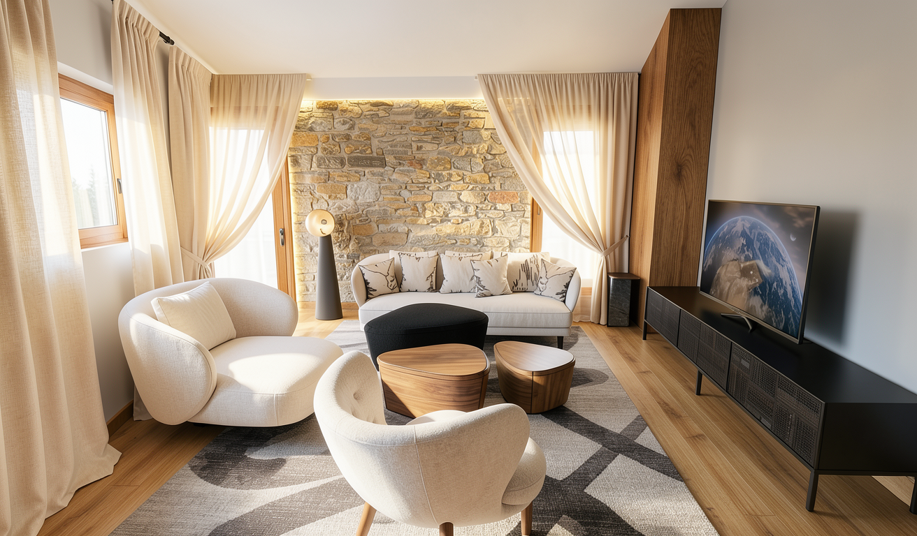 ilumina el contorno del muro de piedra agrega cortinas que vayan desde el piso hasta el techo en tonos muy claros con movimineto y forma natural conserva los mismos elementos que se muestran en la imagen original no cambies nada
