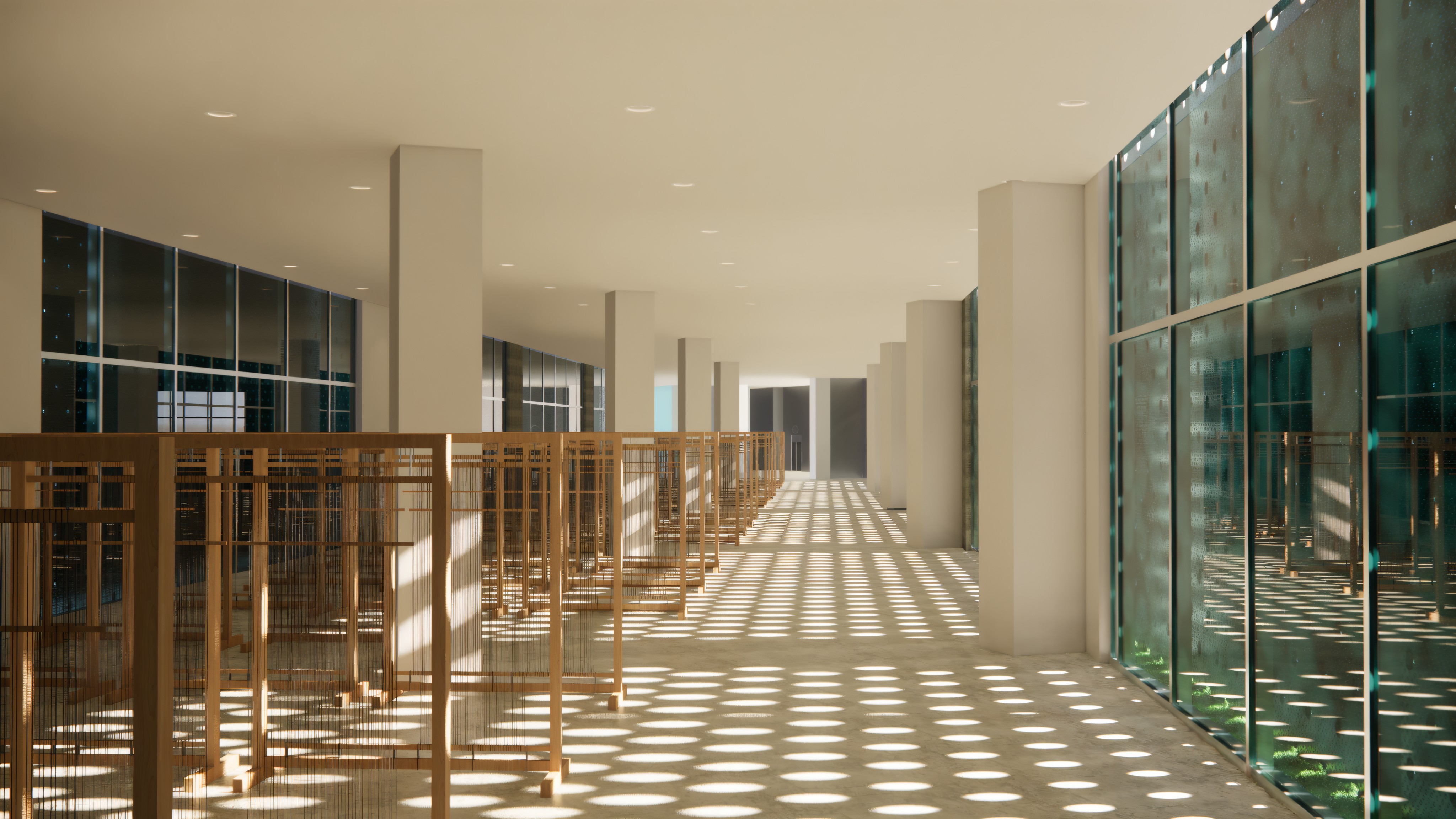 make the interior render more like the reference keep the shadows of the original add more entourage if possible this is a textile factory