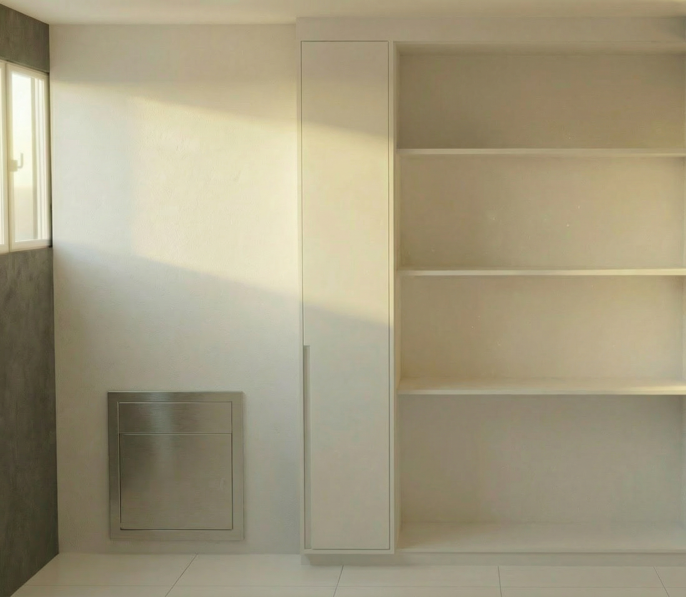 modernist exterior shot enhance shelving with light grey laminate keep the lowest floor shelf as per current image do not change anything architecture