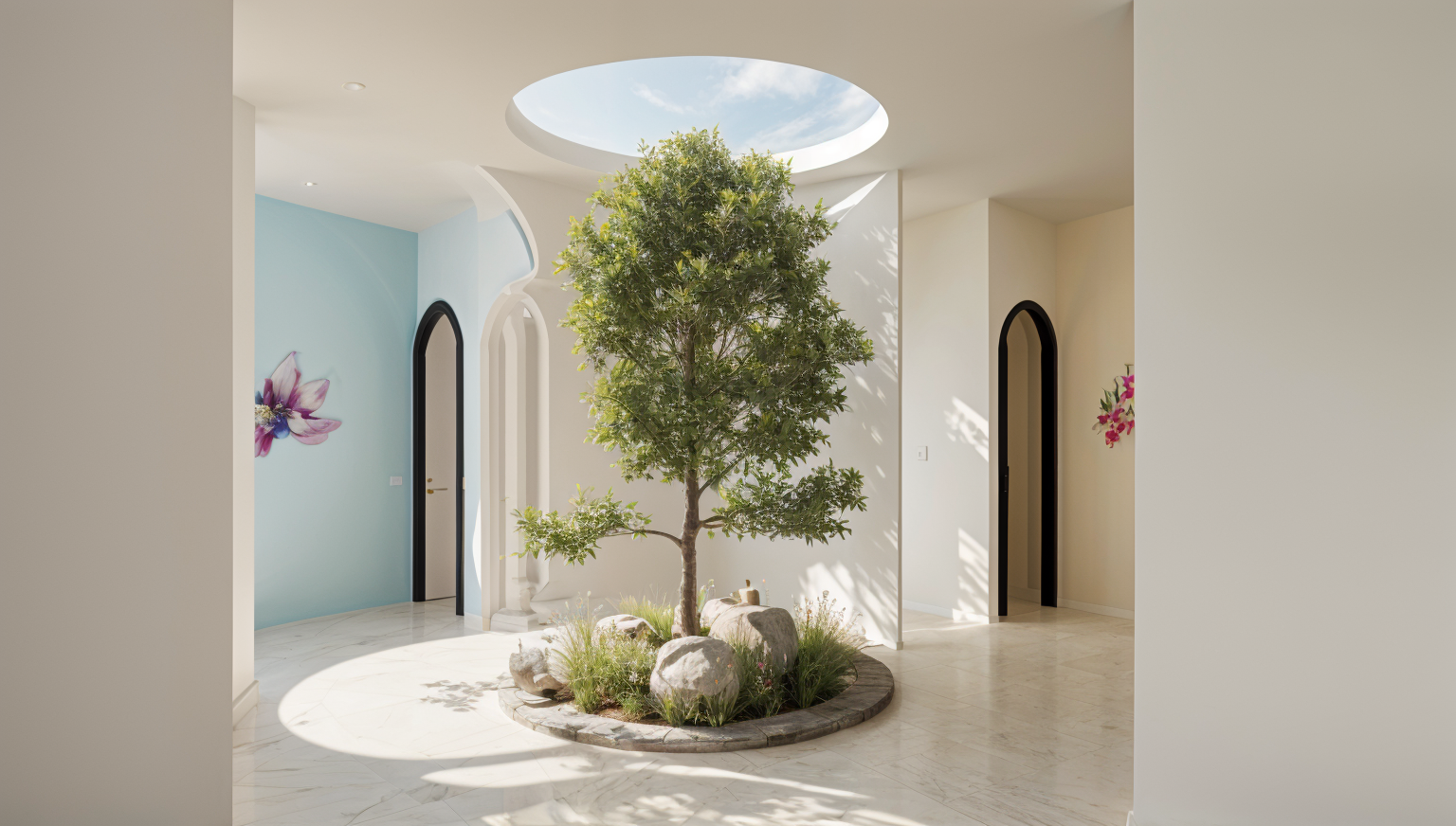 create a covered loggia in front of the house that is not connected to the main roof but stands independent of the existing structure the covered loggia should have stucco over the columns and be made of 8x8 posts place skylights in the roof to show the light coming into the space below the roof should be flat