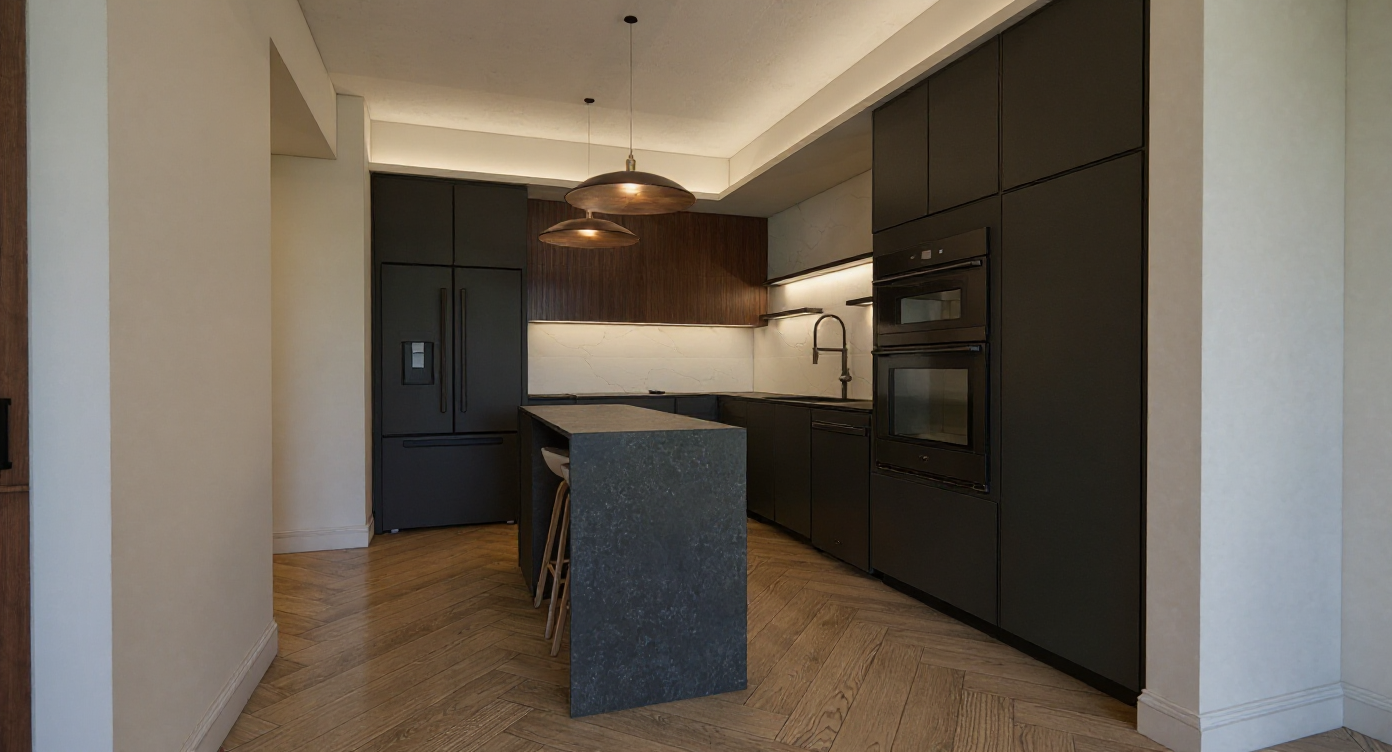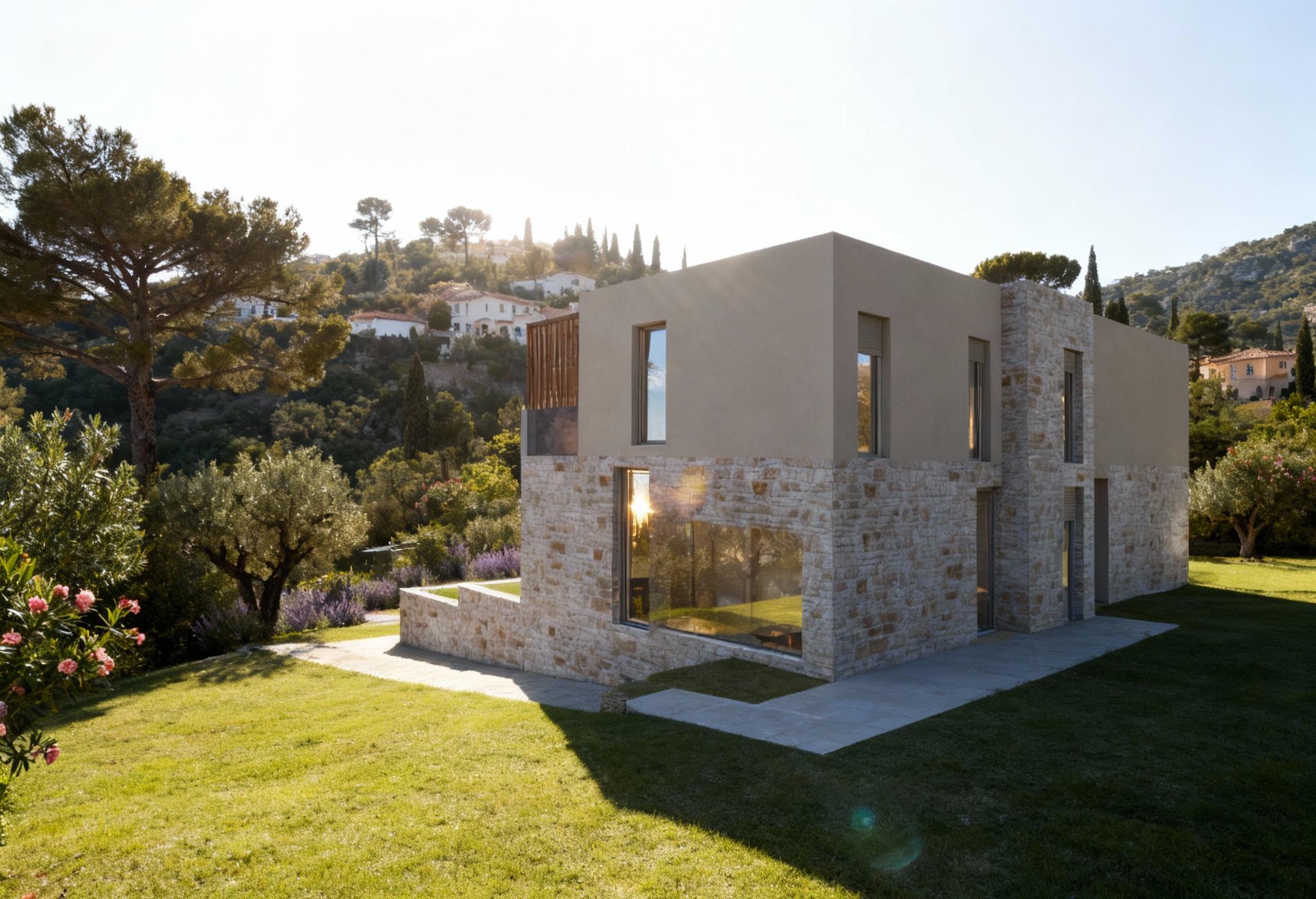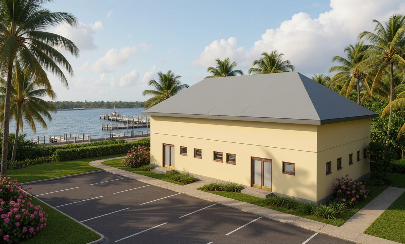 in the foreground is a parking lot near the building is landscape with paths leading up to the doors the landscaping near the building consists of flowering shrubs and lush grass on the far side of the building is a tropical harbor with docks the building is very pale yellow clapboard sided the windows are low e glass and the trim is white the roof is light colored metal to the roght of the building is mangroves and tropical trees the parking lot is only in the foreground to the left of the building is a boat ramp leading into the harbor