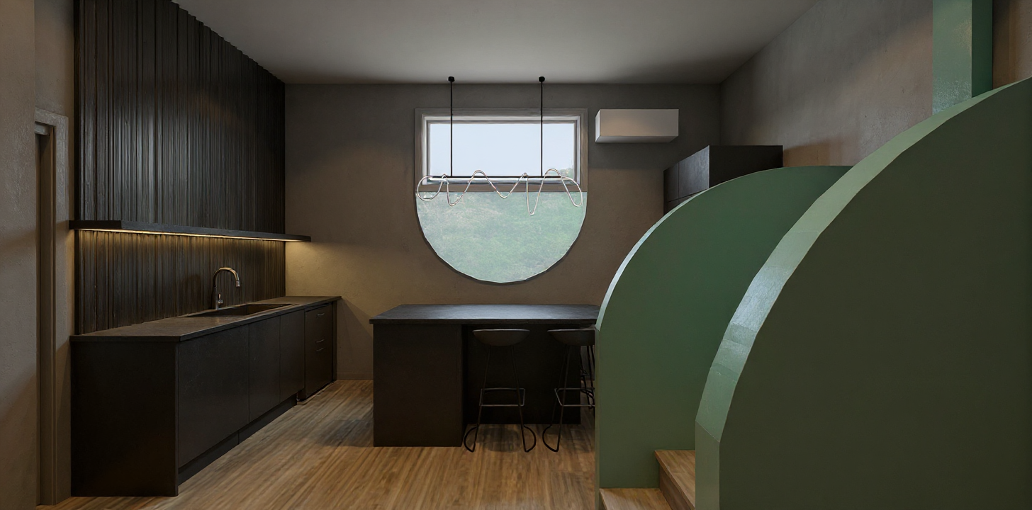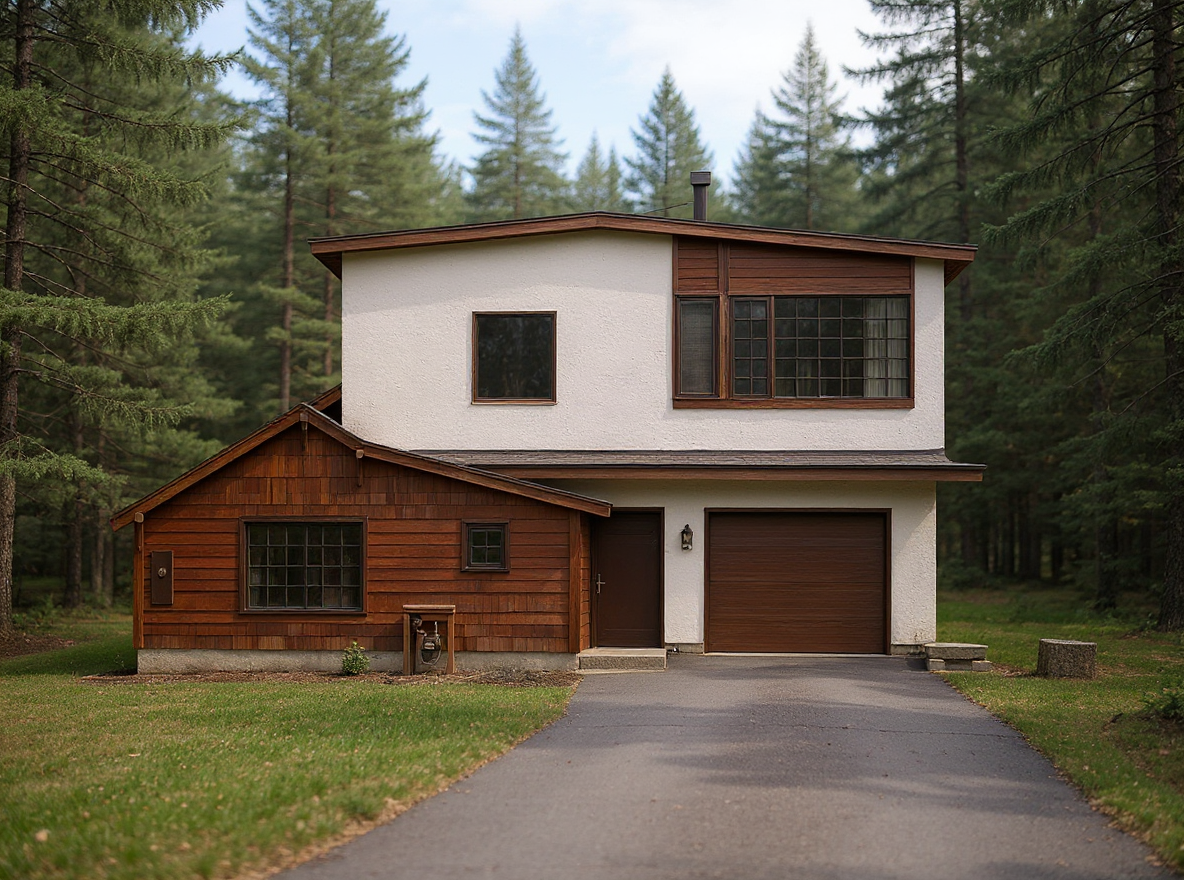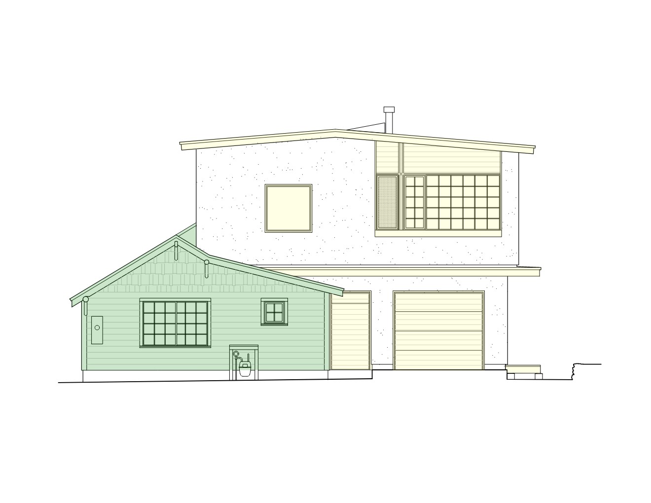 all of the yellow shaded areas are to be light colored buckhorn cedar siding the green shaded portion is to be redwood siding and redwood shakes all of the windows should have dark bronze frames and the rest should be white stucco also show a driveway leading to the garage door and put fir trees in the background