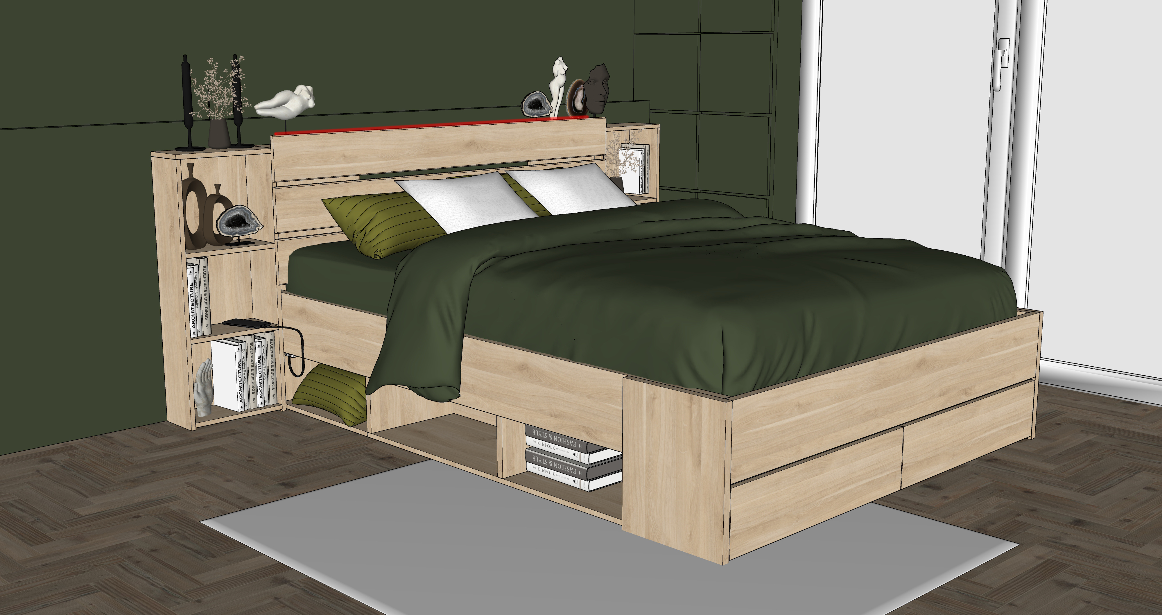 chambre moderne et chaleureuse au design naturel grand lit avec drap beige couvertures vert fonc et coussins assortis mur d coratif vert textur plantes tombantes fix es en hauteur suspensions avec ampoules vintage en verre sol en bois clair grand tapis gris chaussures dans les niches basses du lit ambiance cosy style contemporain et minimaliste rendu photor aliste haute r solution