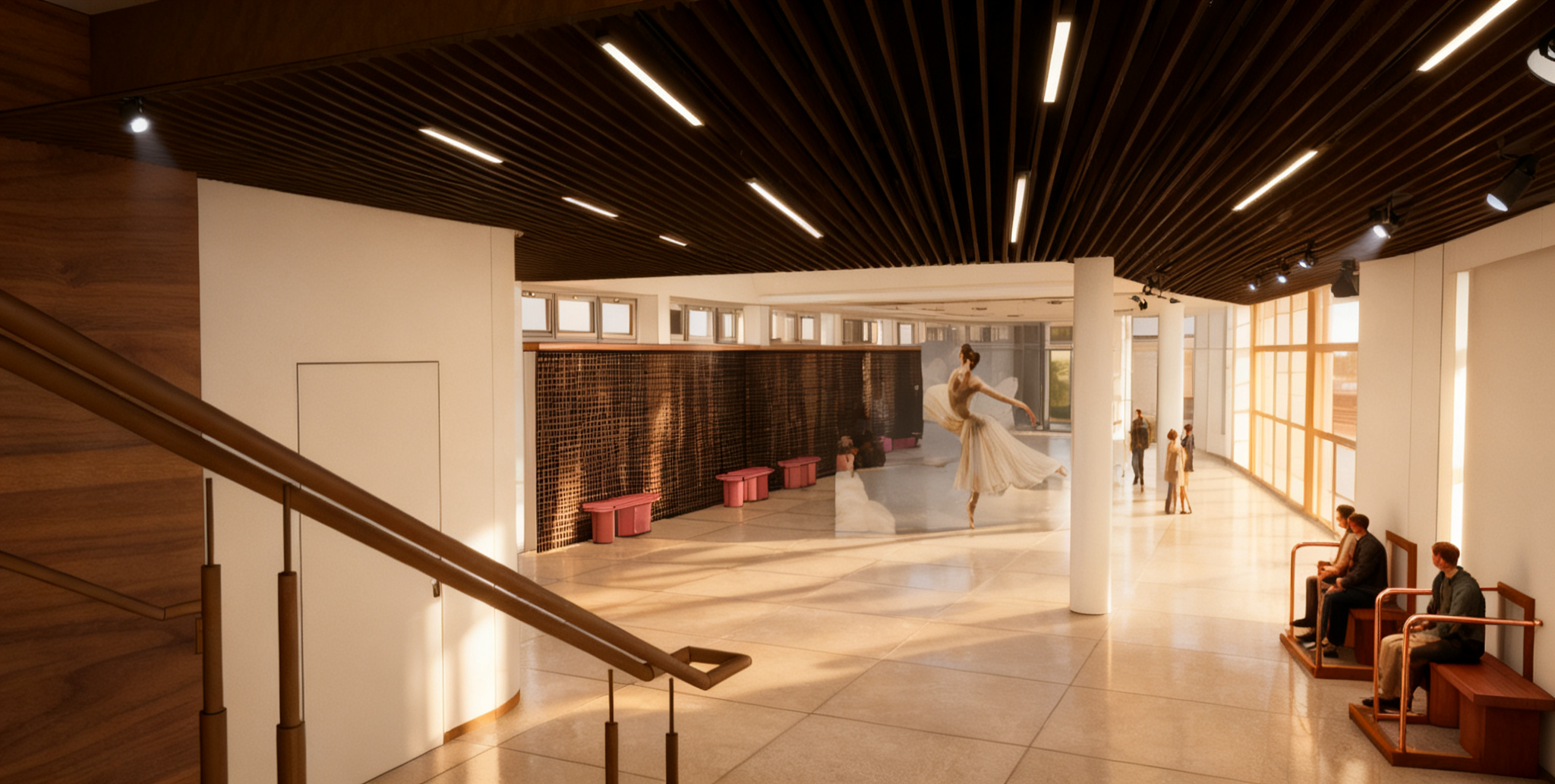 modern cultural building foyer interior warm light from window elegant people copper handrail perforated wooden panels with led light textil bench light interior matte floor led inside the ceiling led between lamellas spotlights pleasant atmosphere