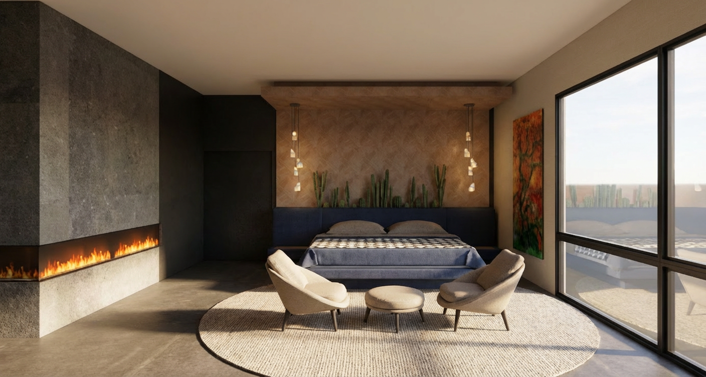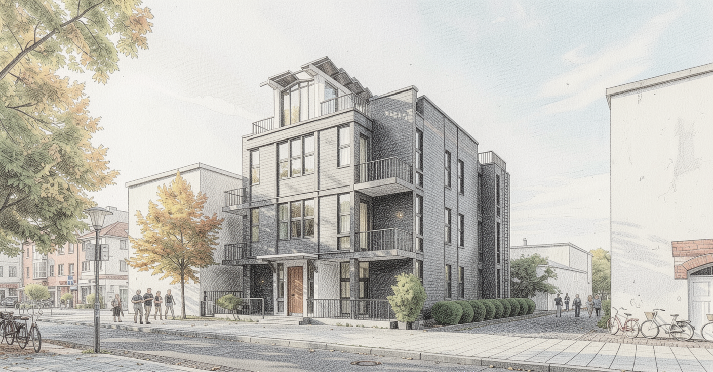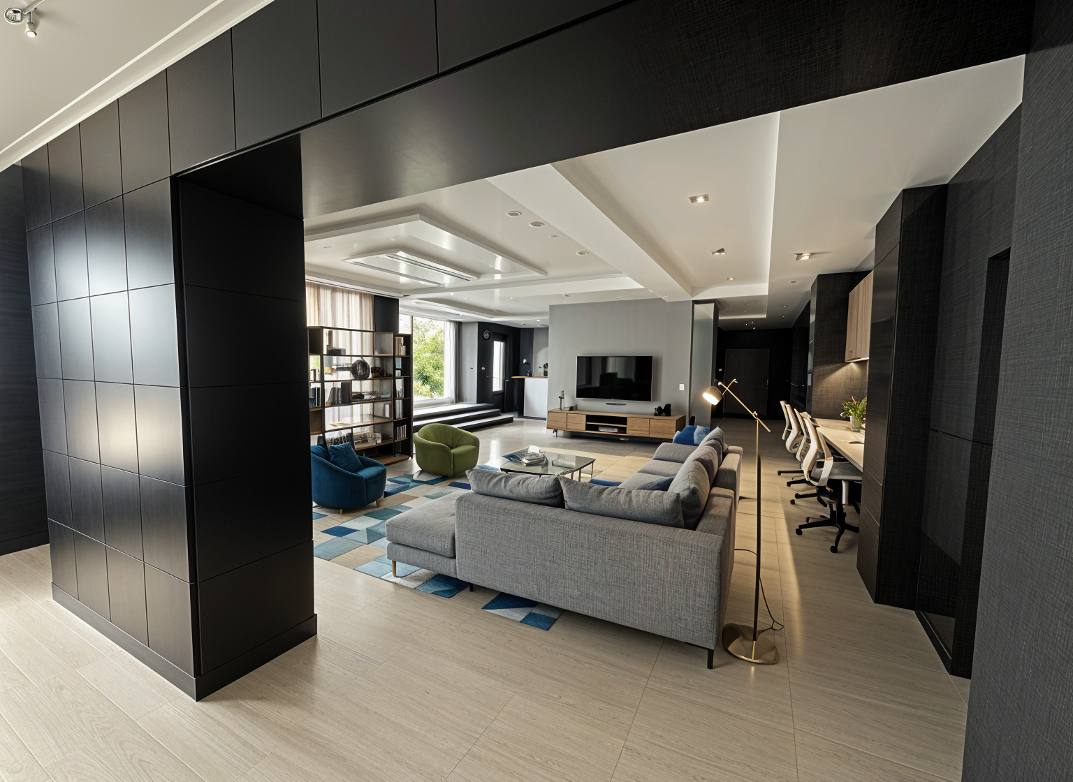 create a realistic architectural render of the image the image should depict a picturesque holiday park in the english countryside the park contains lodge style homes which are clad in a mixture of balck timber and natural light coloured timber they are modern in appearance and have large windows in the centre of the park is a curved leisure building which is clad in a natural light timber and a cream render to the front of the leisure building there is a small lake with a childrens play area to the left the image should be set in early spring and the glazing in the image should be reflective
