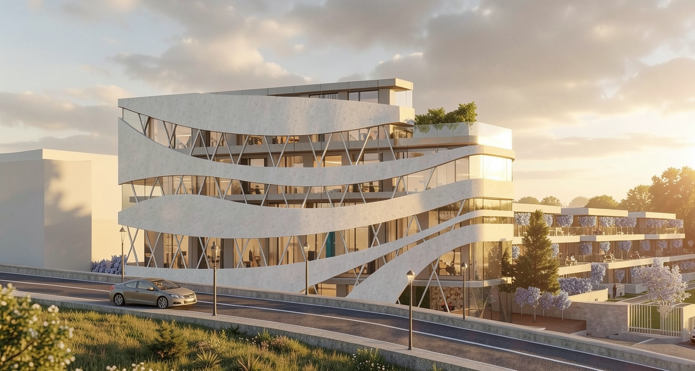 transform the input campus site plan into a refined architectural sketch style illustration maintain exact building footprints roof outlines circulation paths stairs ramps parking layouts and labeling hierarchy apply soft hand drawn linework with slightly irregular edges light pencil and ink textures and subtle sketch imperfections introduce minimalistic trees with rounded canopies simplified shrubs and gentle landscape hatching use a calm green forward color palette with muted earth tones soft grays and warm off white buildings sidewalks and paths should appear lightly shaded and human scaled the overall composition should feel clean diagrammatic and architectural like a presentation site plan with an artistic touch not a photorealistic rendering